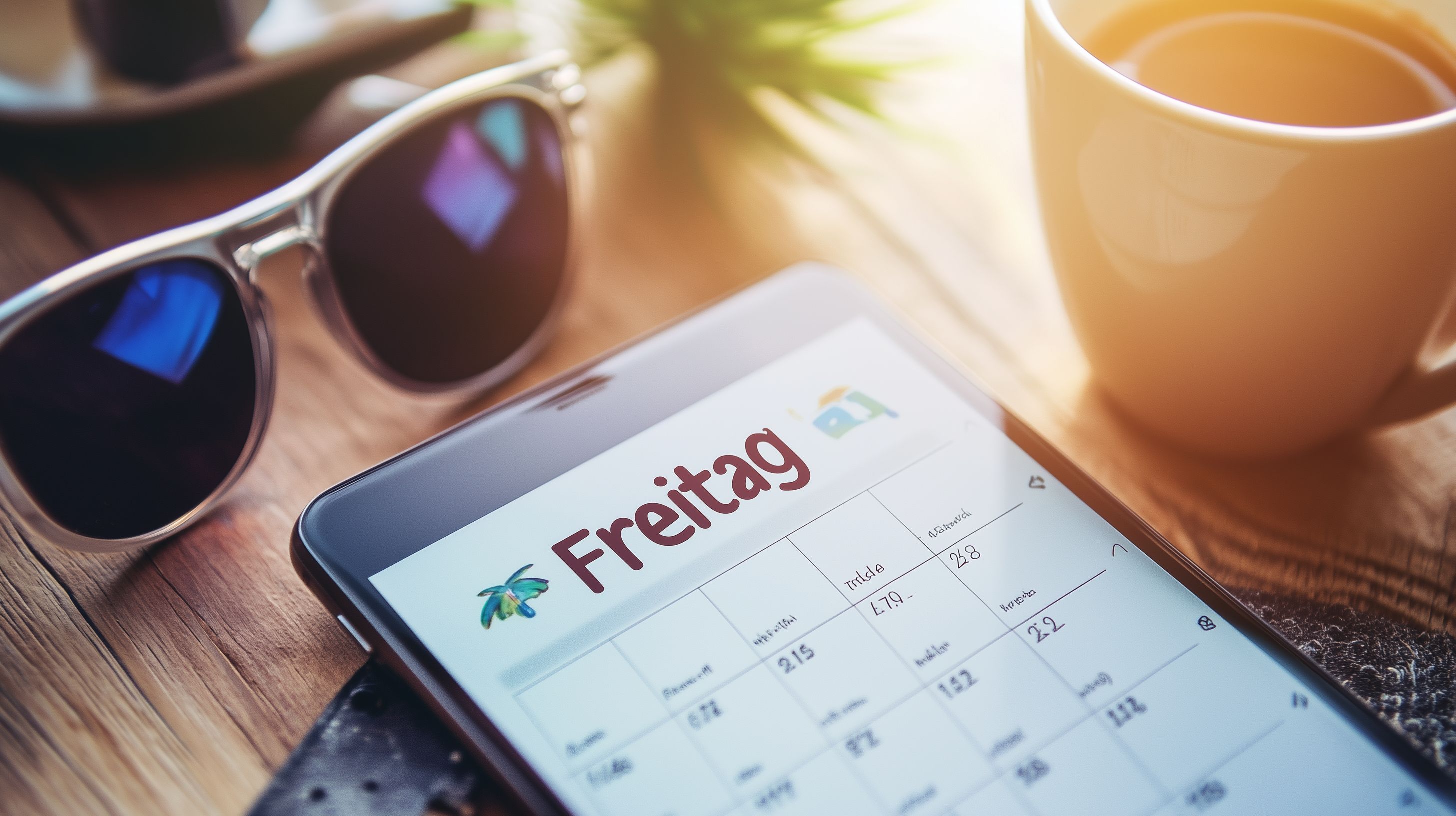 Das Bild zeigt einen Nahausschnitt eines Smartphones mit einem digitalen Kalender, der den Freitag hervorhebt. Der Smartphone-Bildschirm liegt auf einem Holztisch, umgeben von Elementen wie einer Sonnenbrille und einer Kaffeetasse. Die Komposition ist minimalistisch und fokussiert sich auf das Smartphone-Display als Hauptmotiv. Dieses kostenloses Stockfoto in hoher Auflösung unter einer Creative-Commons-Lizenz eignet sich perfekt für Blogbeiträge, Social-Media-Posts oder Newsletter zum Thema Produktivität, Organisation und Terminplanung. Der Fokus auf den digitalen Kalender vermittelt einen modernen, technologieaffinen Eindruck.