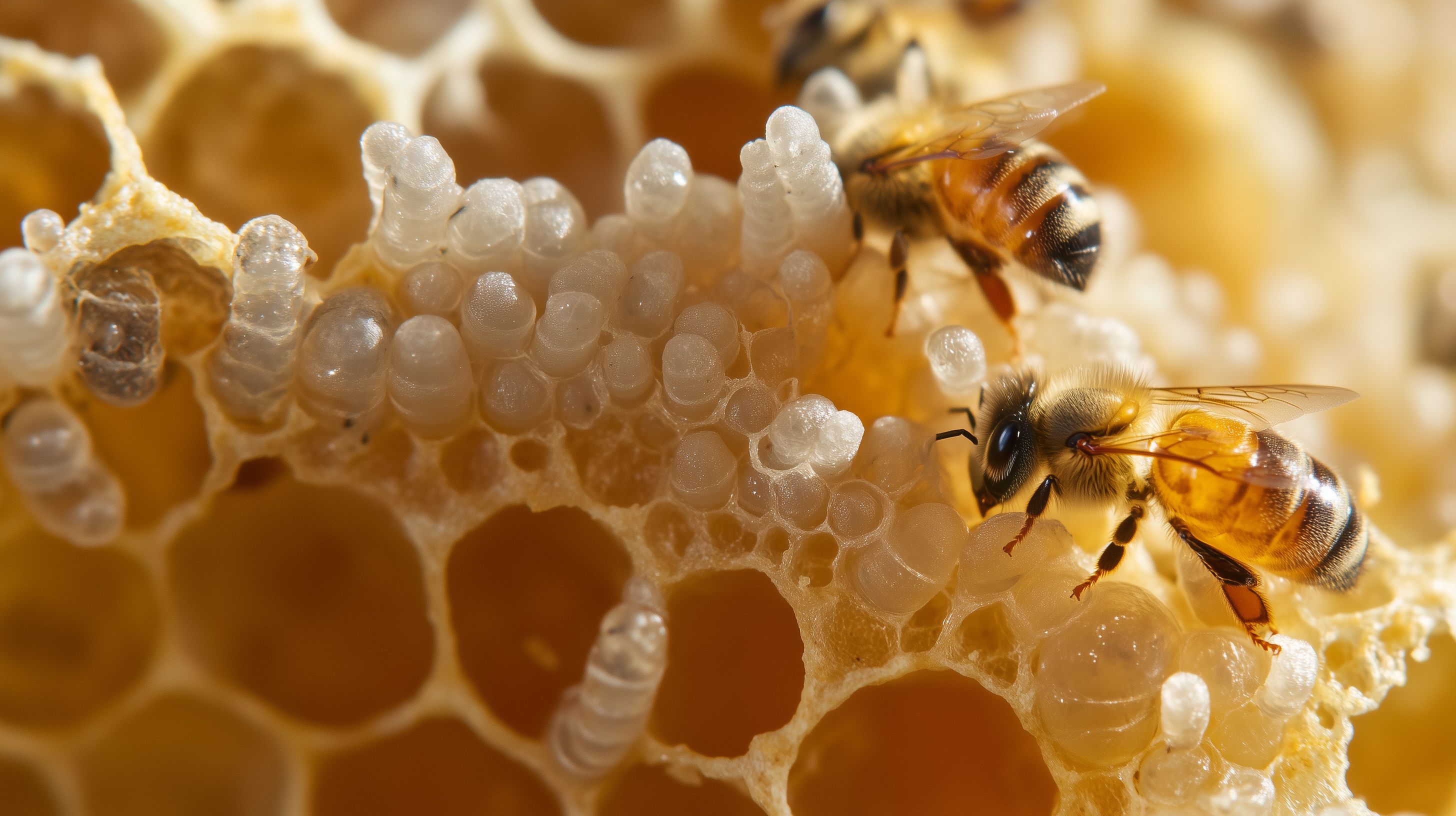 Dieses detaillierte Foto zeigt einen Ausschnitt aus einem Bienenstock. Es ist eine Nahaufnahme von Bienenlarven, die sich in einer Wabe befinden. Die zahlreichen, sechseckigen Wabenzellen sind mit einer goldenen, honigähnlichen Substanz gefüllt. Eine Biene ist ebenfalls auf der Wabe zu sehen, vermutlich bei der Pflege der Larven oder der Honigproduktion. Das Bild besticht durch seine strukturierte, organische Ästhetik und die warmen Gelbtöne, die eine natürliche und authentische Stimmung vermitteln. Als kostenloses Stockfoto in hoher Auflösung und unter einer Creative-Commons-Lizenz eignet es sich ideal für den Einsatz in Blogs, Newslettern, Social-Media-Beiträgen oder Werbekampagnen rund um Themen wie Bienen, Honig, Naturkosmetik oder Landwirtschaft.