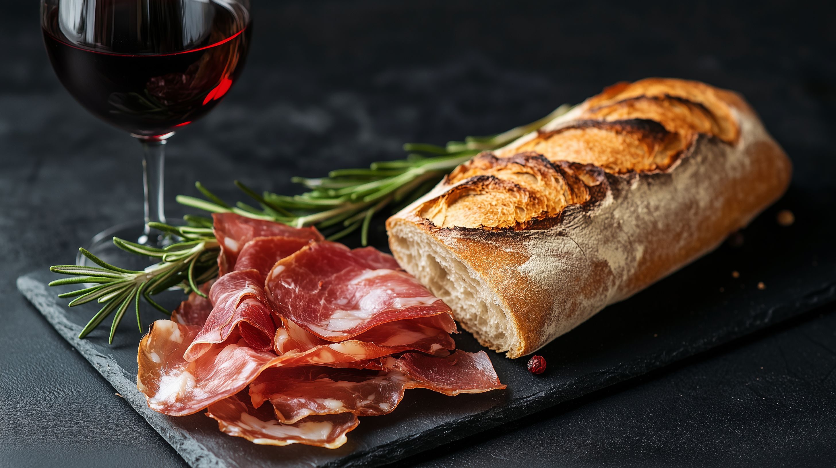 Das Bild zeigt ein rustikales, aufgeschnittenes Brot, serviert auf einer dunklen Schiefertafel. Neben dem Brot liegen geschnittene Scheiben von Schinken (Prosciutto) sowie ein Zweig frischer Rosemarin. Ein Glas Rotwein komplettiert die Szene und verleiht ihr eine stimmungsvolle, mediterrane Atmosphäre. Die Komposition spielt mit den warmen, erdigen Farbtönen und dem rustikalen Charakter der Lebensmittel, was das Bild für den Einsatz in Lifestyle-Blogs, Gastronomie-Werbung oder Rezept-Sammlungen prädestiniert. Dieses kostenlose, hochauflösende Stockfoto unter Creative-Commons-Lizenz ist ideal für Ihre nächste Publikation.