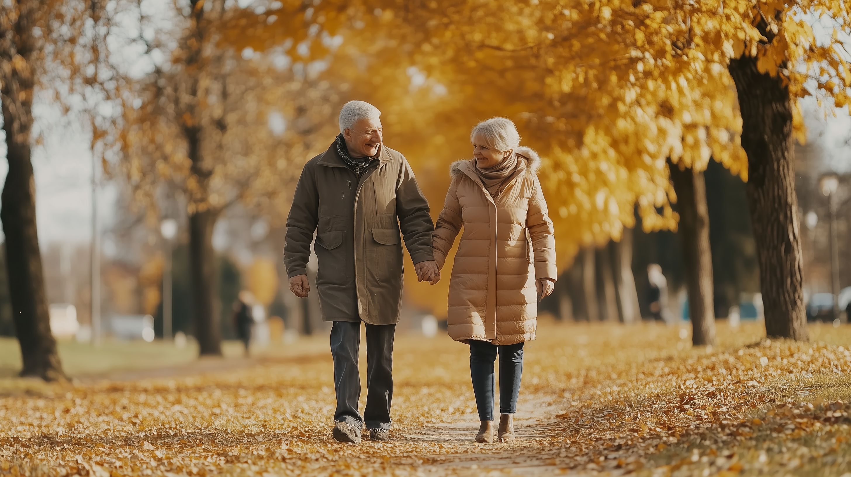 Das Bild zeigt ein älteres Paar, das bei strahlendem Herbstlicht Hand in Hand einen Waldweg entlanggehen. Die leuchtend gelben Blätter der Bäume verleihen der Szene einen warmen, stimmungsvollen Charakter. Der Fokus liegt auf der Zweisamkeit und Verbundenheit der beiden, die offenbar einen entspannenden Spaziergang durch die Natur genießen. Das Foto eignet sich hervorragend als kostenloses Stockfoto für Beiträge rund um Themen wie Alter, Partnerschaft, gesundes Altern oder Freizeit im Ruhestand. Die hohe Auflösung und die Creative-Commons-Lizenz machen es zu einem vielseitig verwendbaren Bildmotiv.