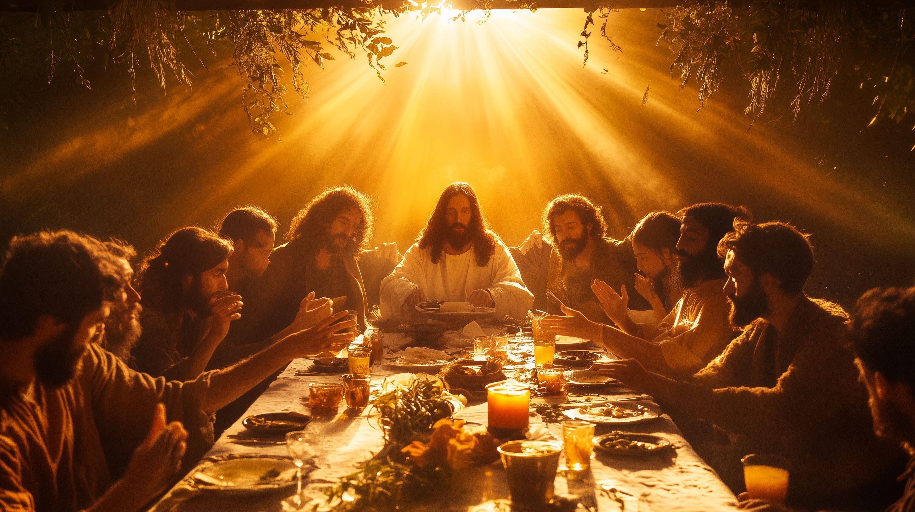 Das Bild zeigt eine stimmungsvolle Szene des letzten Abendmahls mit Jesus und seinen Jüngern. In goldenem Licht sitzen sie an einem rustikalen Holztisch und teilen gemeinsam eine Mahlzeit. Jesu Gestalt ist im Zentrum des Geschehens und von einem strahlenden Lichtschein umgeben, das die Aufmerksamkeit auf ihn lenkt. Die Jünger blicken erwartungsvoll zu ihm auf und scheinen in tiefes Gespräch vertieft. Die warmen Farben, Schatten und Kerzen erzeugen eine mystische, fast andächtige Atmosphäre.