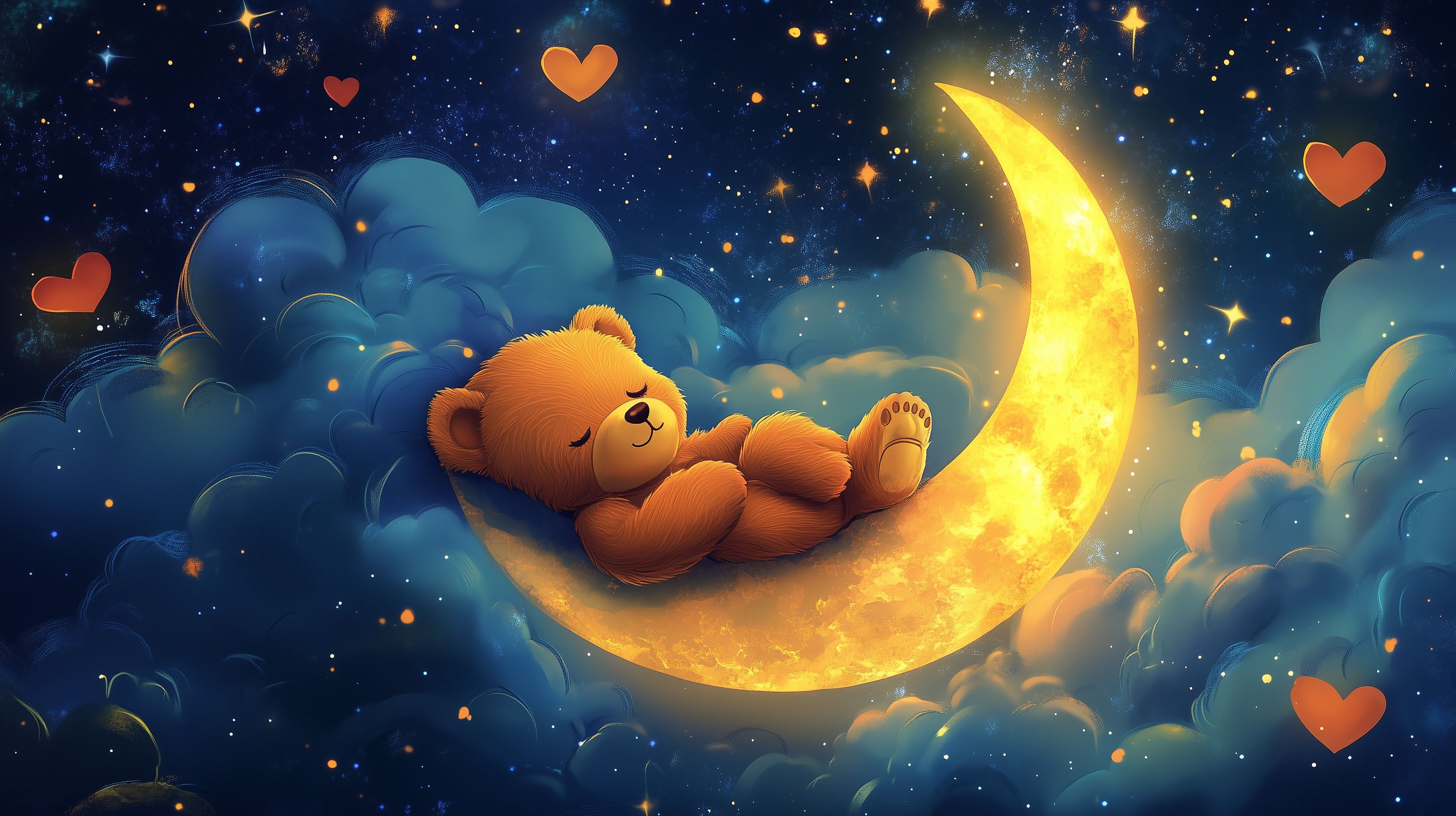 Dieses stimmungsvolle Bild zeigt einen kuscheligen Teddybären, der gemütlich auf einem leuchtenden Halbmond schläft, umgeben von einer nächtlichen Szenerie mit Sternen und Wolken. Die warmen, pastelligen Farben und die detailreiche Darstellung des Teddy-Charakters schaffen eine bezaubernde und friedliche Atmosphäre. Das Foto eignet sich hervorragend als Hintergrund, Dekor oder Gestaltungselement für verschiedenste Projekte wie Blogs, Newsletter, Werbung, Grußkarten oder Social-Media-Beiträge. Dieses hochauflösende, frei nutzbare Stockfoto unter Creative-Commons-Lizenz verleiht Ihren Projekten einen fantasievollen und stimmungsvollen Look.