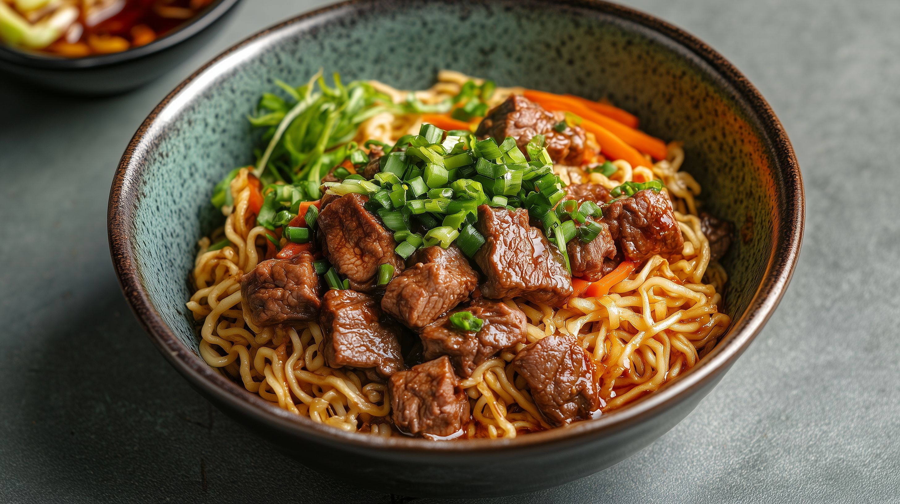 Dieses Foto zeigt eine appetitliche Schüssel mit geschmortem Rindfleisch, Reisnudeln und frischen Frühlingszwiebeln. Das Gericht ist in einer dunkelgrünen, rustikalen Schüssel angerichtet und wurde offensichtlich sorgfältig zubereitet. Die Farben und Texturen machen das Bild sehr einladend und lassen den Betrachter das leckere Essen förmlich riechen. Dieses hochauflösende Foto eignet sich hervorragend für den Einsatz in Blogs, Newslettern, Social-Media-Beiträgen oder Werbeanzeigen im kulinarischen Bereich. Das Bild steht unter einer Creative-Commons-Lizenz und kann somit kostenfrei genutzt werden.