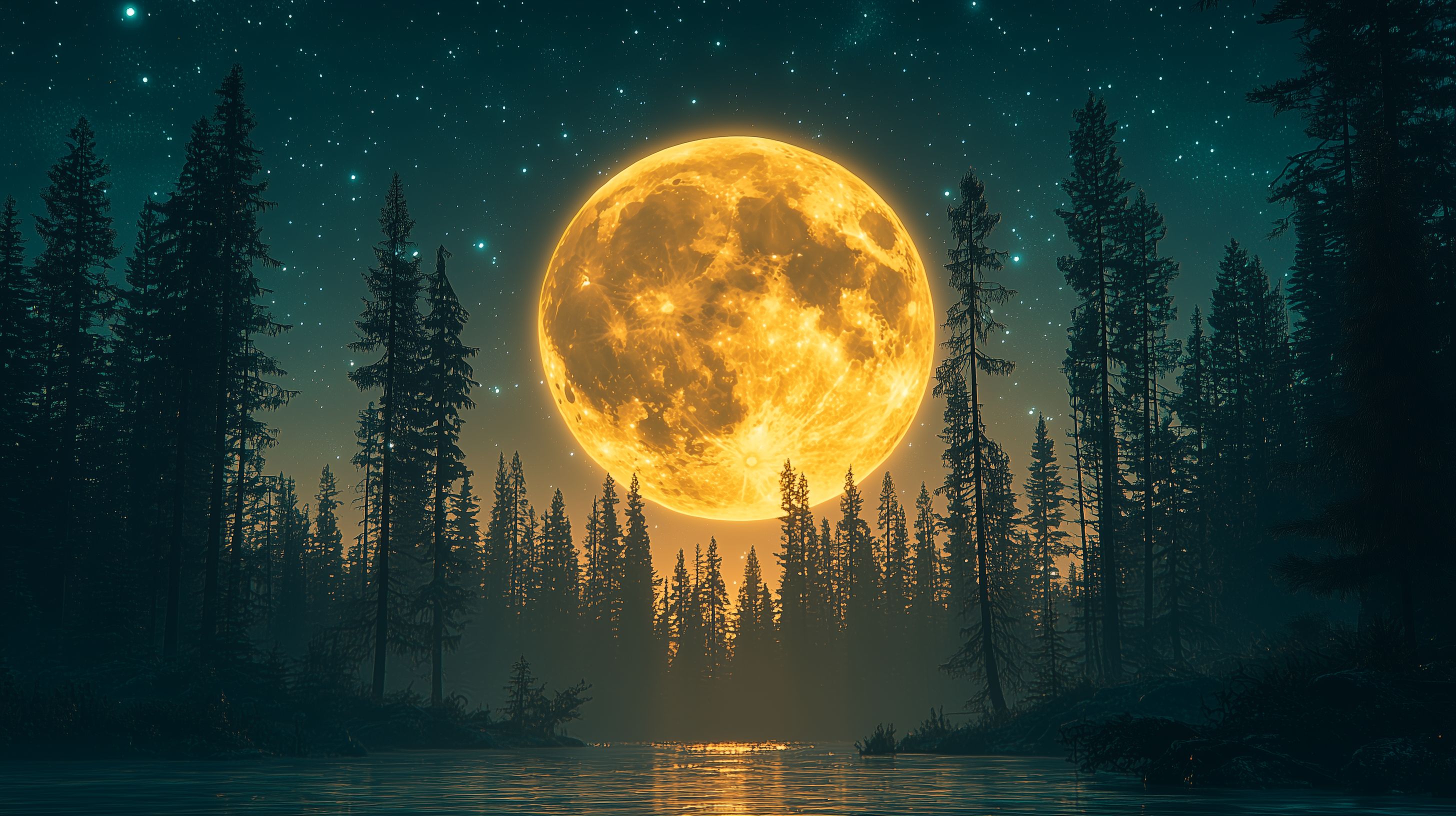 Dieses fantastische Foto zeigt eine magische Vollmondnacht über einem ruhigen Nadelwald. Der riesige, leuchtend gelbe Mond dominiert den klaren Nachthimmel, der mit funkelnden Sternen übersät ist. Die hohen Bäume werfen ihre Schatten auf den spiegelglatten See, dessen Oberfläche die Mondreflexion wie ein Spiegel wiedergibt. Die Szene ist von einer mystischen Stimmung umgeben und verströmt eine romantische, entspannende Atmosphäre. Dieses kostenfreie Stockfoto in hoher Auflösung eignet sich perfekt als Hintergrund oder Wallpaper für Blogs, Newsletter, Social-Media-Posts und andere kreative Projekte unter Creative-Commons-Lizenz.