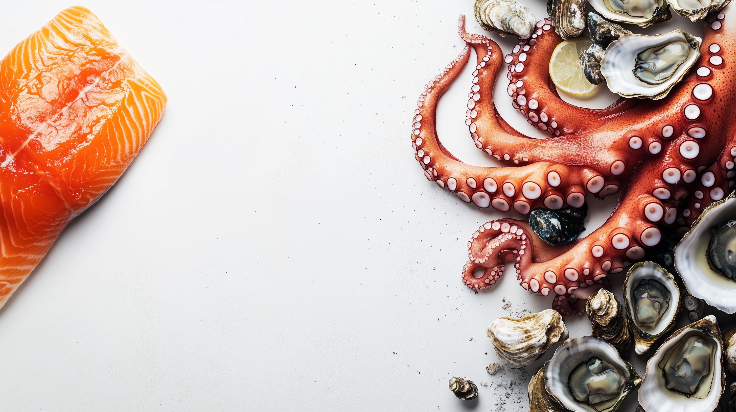 Das Bild zeigt eine luxuriöse Anordnung von frischen Meeresfrüchten und einem Lachsfilet auf hellem Hintergrund. Im Vordergrund sind ein großer, roter Tintenfischtentakel und eine Auster zu sehen, während im Hintergrund weitere Delikatessen wie Austern und Shrimps platziert sind. Die kräftigen Farben, die saubere Komposition und das minimale Styling verleihen dem Bild eine hochwertige, appetitliche Ausstrahlung. Dieses Foto eignet sich hervorragend als Titelbild für Rezeptsammlungen, Kochbücher oder Beiträge rund um das Thema Meeresfrüchte und Fisch. Als kostenloses Stockfoto in hoher Auflösung und unter einer Creative-Commons-Lizenz kann es vielfältig in Online-Medien, Werbung oder Social-Media-Posts eingesetzt werden.