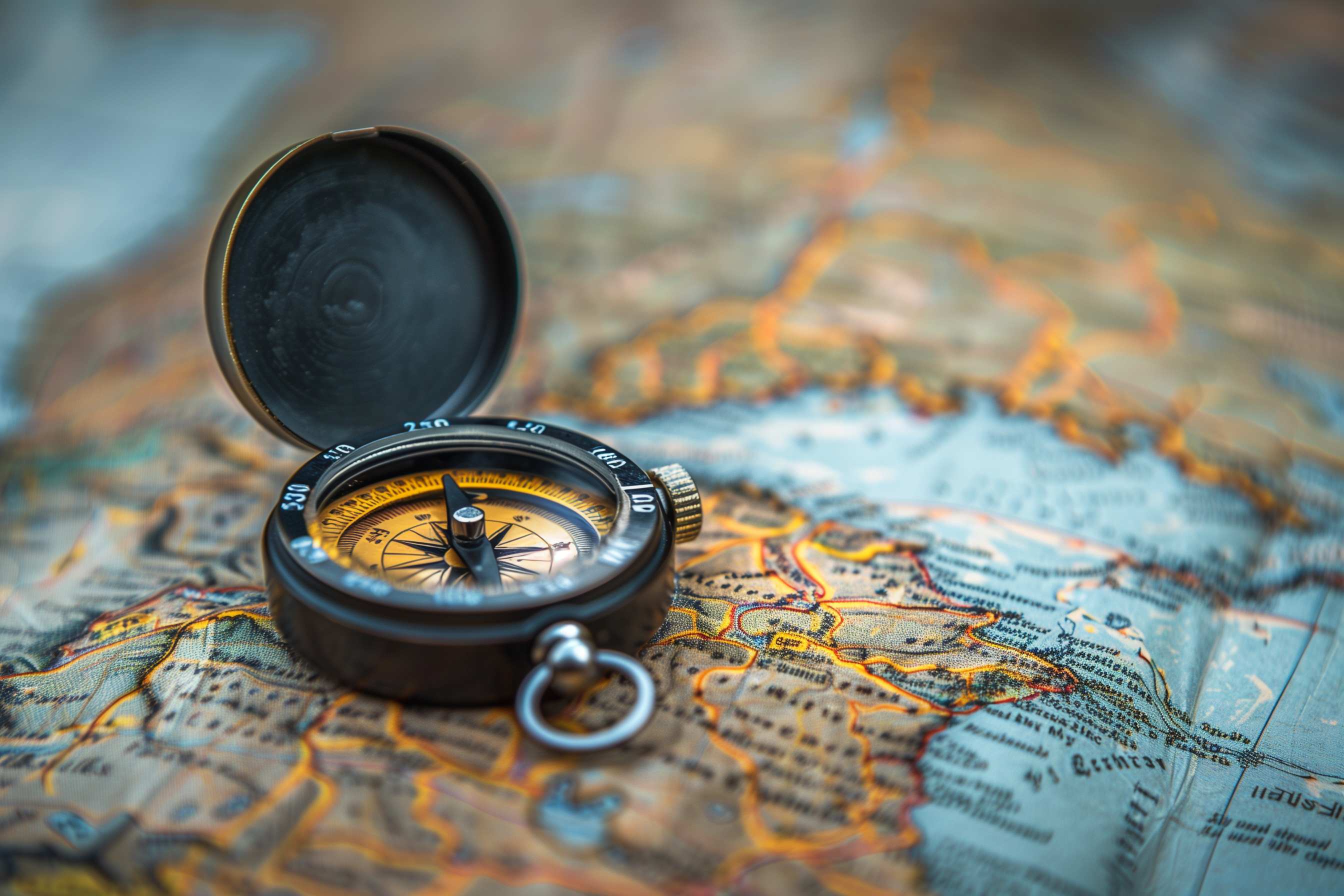 Das Bild zeigt einen alten, schwarz-goldenen Kompass, der auf einer detaillierten Karte platziert ist. Die Karte ist in warmen Tönen gehalten und vermittelt eine Atmosphäre des Entdeckens und Abenteuers. Der Kompass, als klassisches Navigationsinstrument, steht im Zentrum des Bildes und lenkt den Blick des Betrachters auf sich. Diese Darstellung könnte ideal für Webseiten, Blogbeiträge, Werbekampagnen oder Social-Media-Kanäle genutzt werden, die sich mit Themen wie Reisen, Entdeckungen, Outdoor-Aktivitäten oder Naturerlebnissen beschäftigen. Als kostenloses Stockfoto in hoher Auflösung und unter einer Creative-Commons-Lizenz bietet es vielfältige Gestaltungsmöglichkeiten für Kreativschaffende.