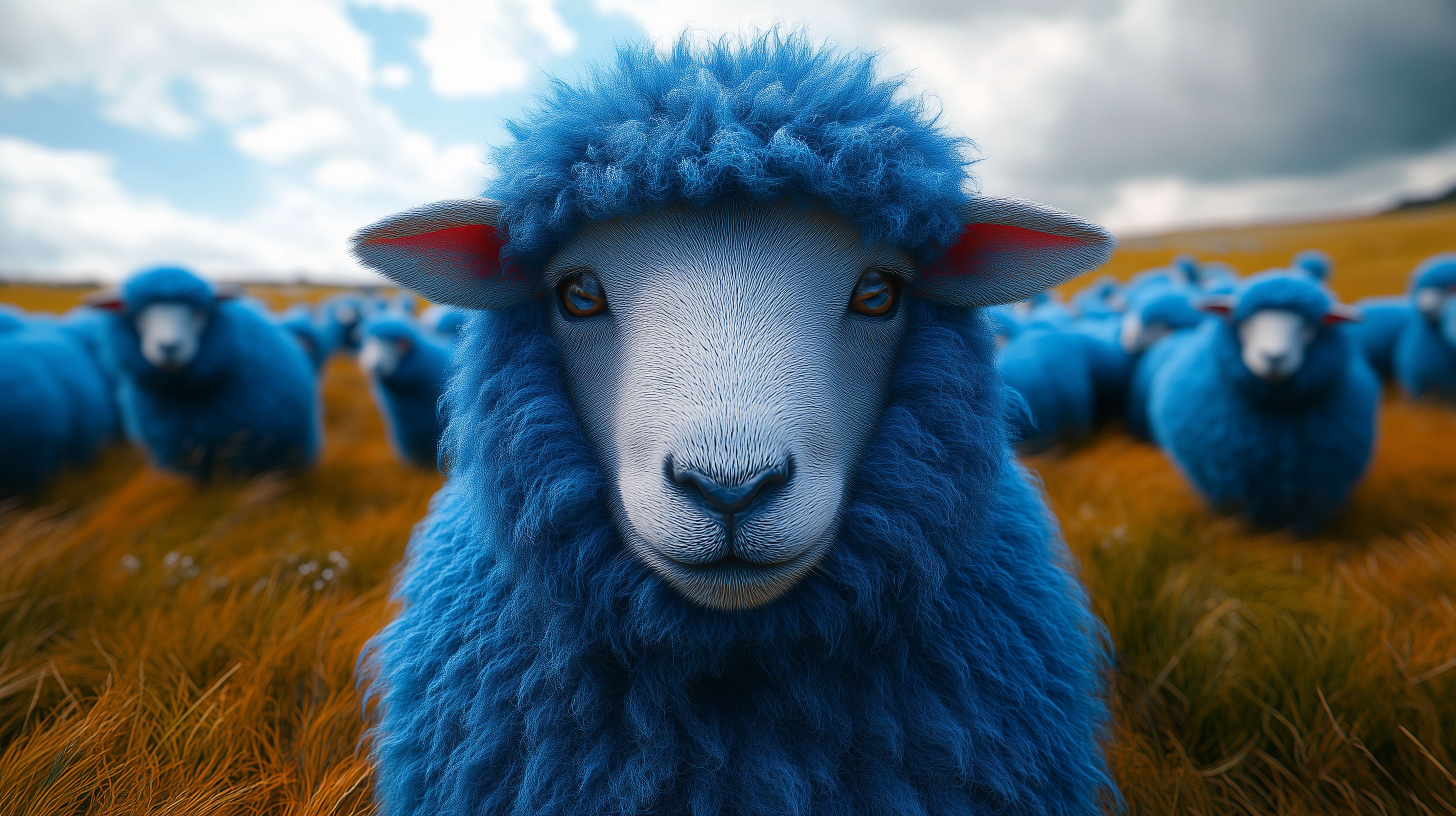 Das Bild zeigt eine Herde blau gefärbter Schafe, die auf einer grünen Wiese unter einem bewölkten Himmel weiden. Die Schafe haben eine auffallende, flauschige Fellstruktur und ihre Blicke sind direkt auf den Betrachter gerichtet, was dem Bild eine lebendige und fast menschliche Ausstrahlung verleiht. Die stimmungsvollen Farben und die detailreiche Darstellung machen das Foto zu einem einzigartigen und hochwertigen Stockfoto, das sich ideal für die Verwendung in Blogs, Newslettern, Social-Media-Kampagnen oder Werbematerialien eignet. Dieses kostenlose Stockfoto in hoher Auflösung steht unter der Creative-Commons-Lizenz zur Verfügung.