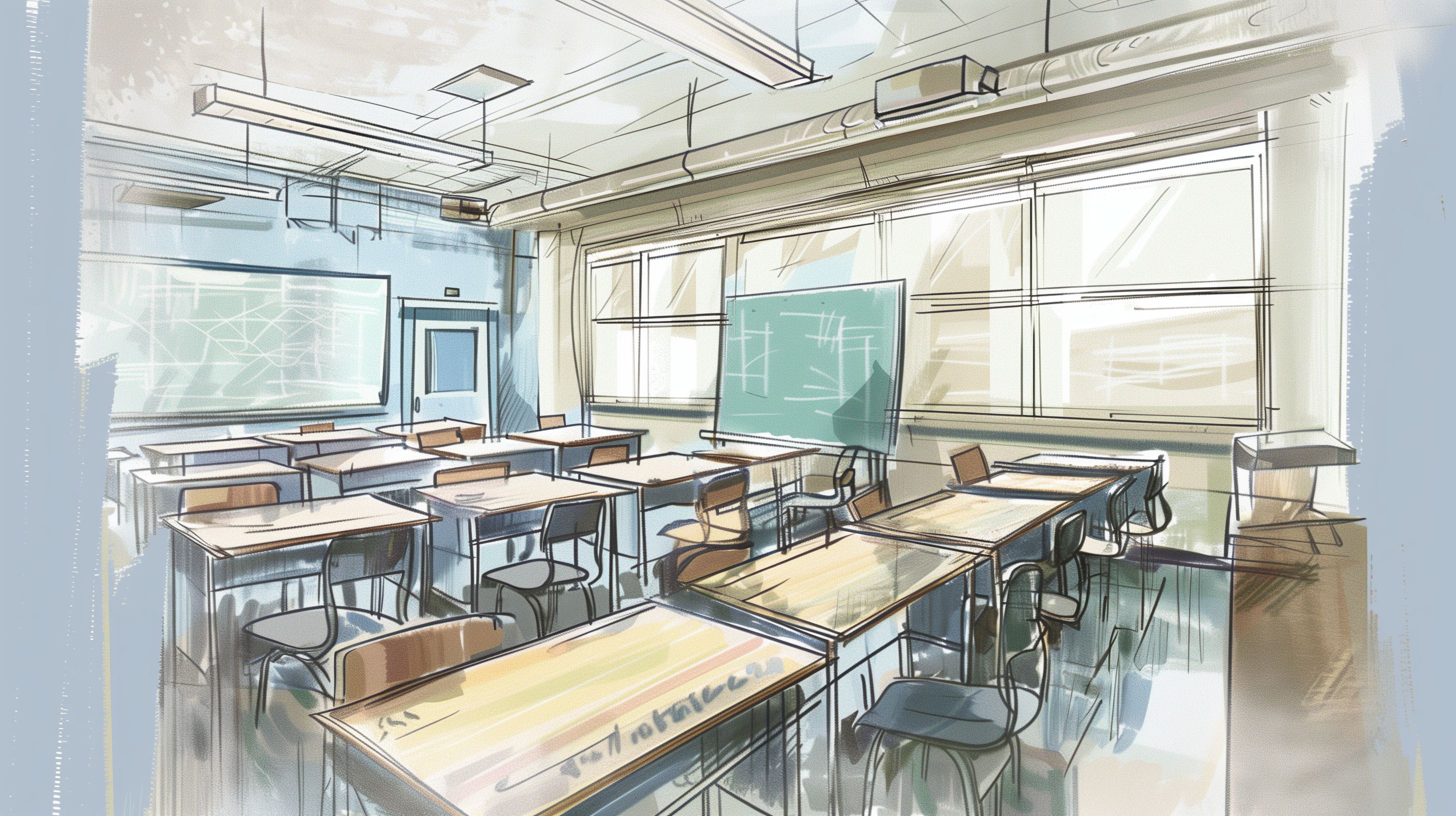 Diese Skizze zeigt ein helles, modern gestaltetes Klassenzimmer mit großen Fenstern, die viel natürliches Licht hereinlassen. Der Raum ist mit Tischen und Stühlen ausgestattet, an der Wand ist eine Tafel oder ein Whiteboard zu sehen. Die Decke ist mit Beleuchtungskörpern versehen, die zusätzliche Helligkeit schaffen. Insgesamt vermittelt das Bild einen freundlichen, offenen und einladenden Eindruck, der ideal für den Einsatz in Bildungsthemen, Blogbeiträgen oder Werbekampagnen rund um Schule und Lernen geeignet ist.