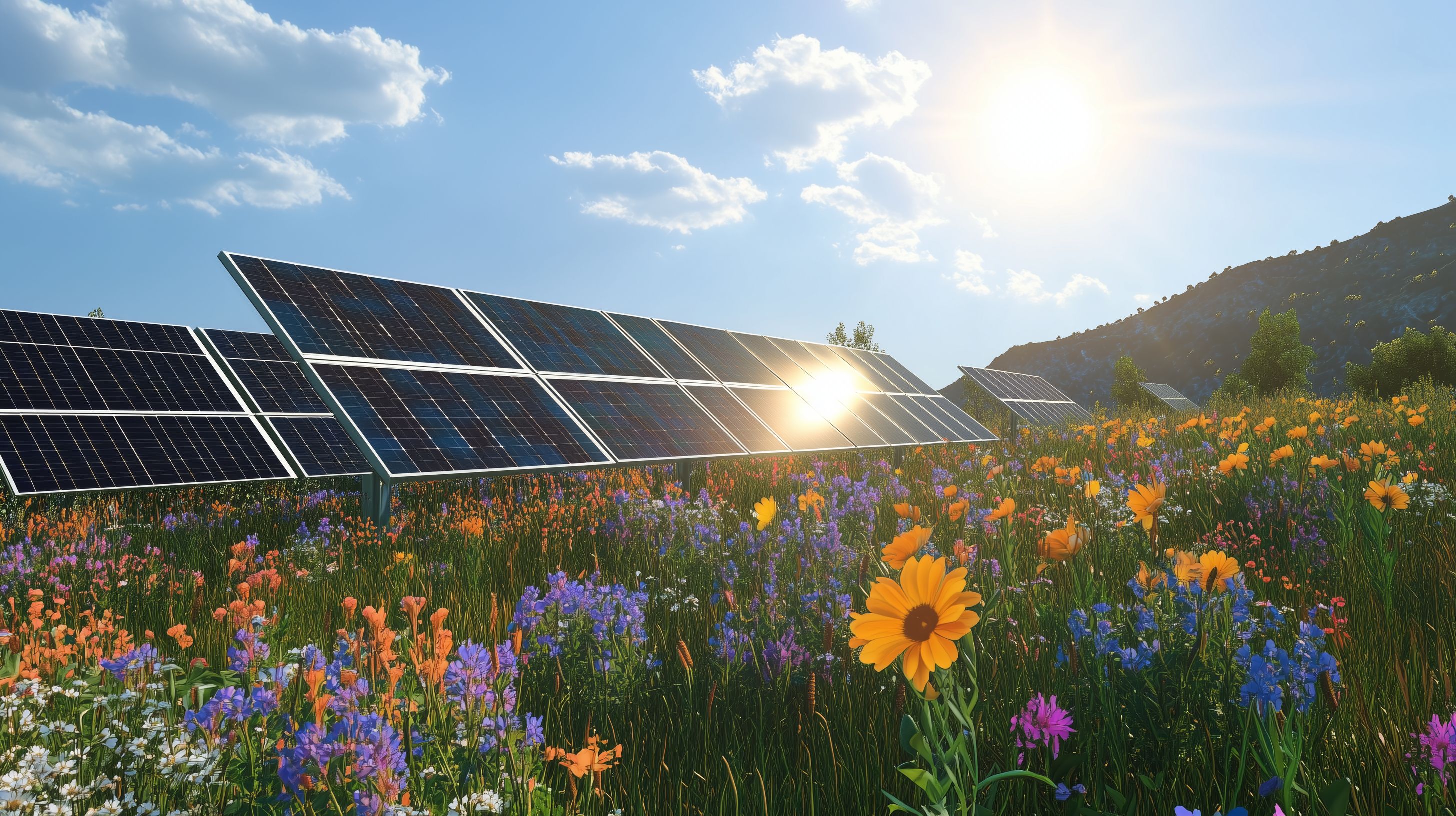 Dieses faszinierende Foto zeigt eine wunderschöne Berglandschaft mit einer blühenden Wiese voller bunter Wildblumen. Vor der idyllischen Naturkulisse erstrecken sich Reihen von Solarmodulen, die die Energie der Sonne einfangen und in saubere elektrische Energie umwandeln. Die Kombination von natürlicher Schönheit und moderner Technologie vermittelt einen Eindruck von Harmonie und Nachhaltigkeit. Dieses kostenfreie Stockfoto in hoher Auflösung ist perfekt geeignet für den Einsatz in Blogs, Newslettern, Social-Media-Beiträgen oder Werbekampagnen, die sich mit erneuerbaren Energien, Umweltschutz oder ländlicher Ästhetik befassen. Es steht unter einer Creative-Commons-Lizenz zur Verfügung.