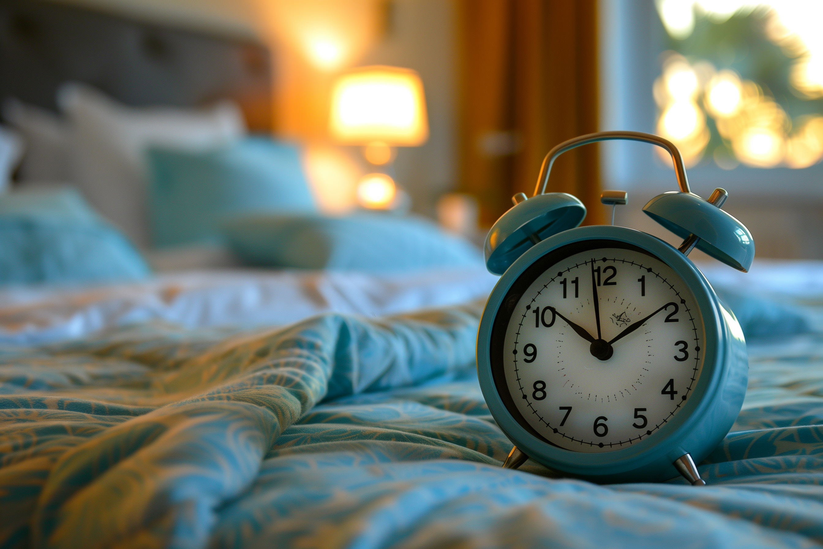 Das Bild zeigt einen Wecker auf einem gemütlichen Bett in einem Schlafzimmer. Der Blick fällt durch das Fenster, das einen weichen, warmen Lichteinfall in den Raum zaubert. Die pastellfarbenen Bettwäsche-Elemente und die sanfte Beleuchtung vermitteln eine friedliche, entspannte Atmosphäre. Dieses kostenfrei verfügbare Stockfoto in hoher Auflösung lässt sich wunderbar für Blog-Beiträge, Newsletter oder Social-Media-Postings zum Thema Schlaf, Entspannung oder Morgenroutine verwenden. Es steht unter der Creative Commons-Lizenz zur Verfügung.