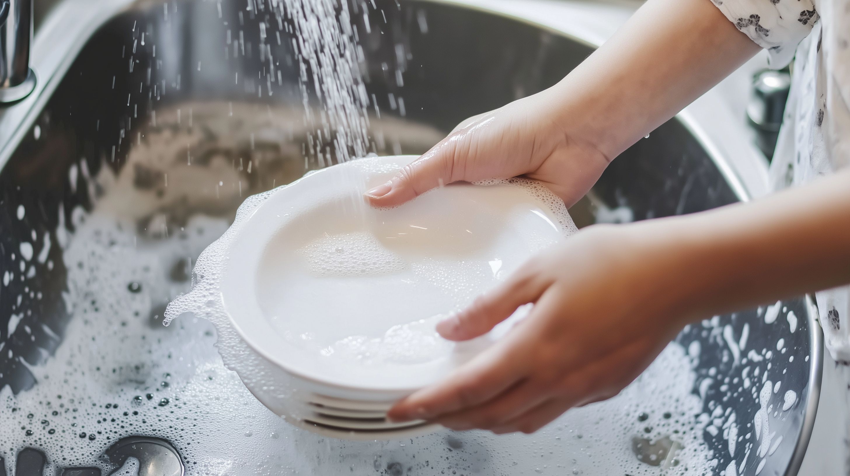 Das Bild zeigt Hände, die Geschirr in einer Spüle reinigen. Der Blick ist auf die Nahaufnahme der Hände fokussiert, die ein weißes Teller unter dem Wasserstrom halten. Spritzer und Schaum sind deutlich zu sehen, was den aktiven, dynamischen Prozess des Spülens vermittelt. Die Szene vermittelt eine Alltagssituation aus der Küche, die für viele Menschen eine regelmäßige Haushaltsaufgabe darstellt. Dieses kostenlose Stockfoto in hoher Auflösung unter der Creative-Commons-Lizenz eignet sich hervorragend für den Einsatz in Blogbeiträgen, Social-Media-Kanälen oder Werbematerialien, die sich mit Reinigung, Haushaltsführung oder Küchenmotiven befassen.