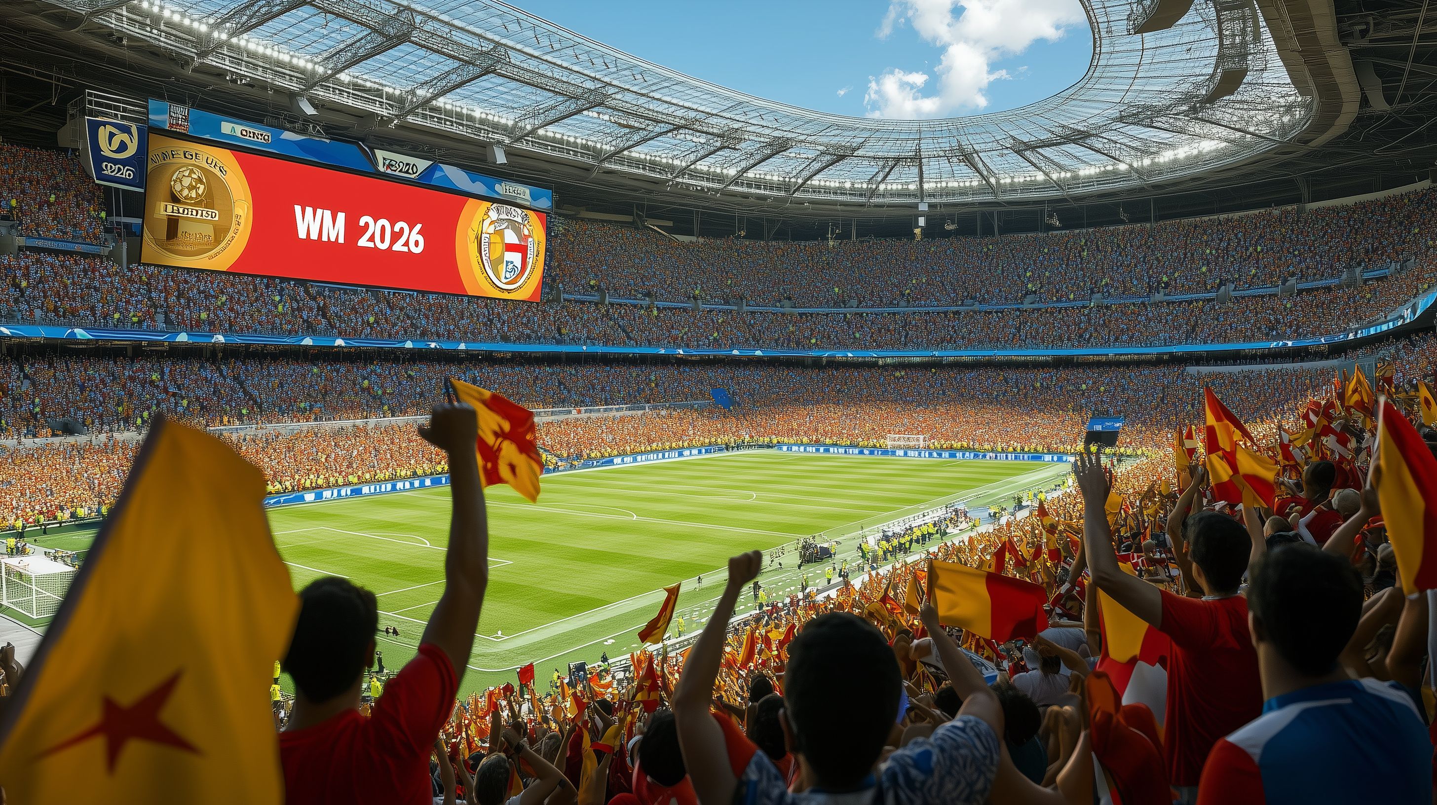 Dieses Foto zeigt ein überfülltes Fußballstadion während der Fußball-Weltmeisterschaft 2026. Tausende begeisterte Fans füllen die Ränge und schwenken Fahnen, um ihre Mannschaft lautstark anzufeuern. Die riesige Spielfläche ist perfekt zu sehen, mit dem WM-Logo prominent platziert. Die imposante Architektur des Stadions und der strahlend blaue Himmel mit Wolken sorgen für eine festliche Atmosphäre. Dieses hochauflösende Stockfoto eignet sich hervorragend als Titelbild oder Hintergrund für Blogbeiträge, Newsletter oder Social-Media-Werbung rund um das Thema Fußball, Sport-Events oder Tourismus. Es steht unter einer Creative-Commons-Lizenz zur kostenfreien Nutzung zur Verfügung.