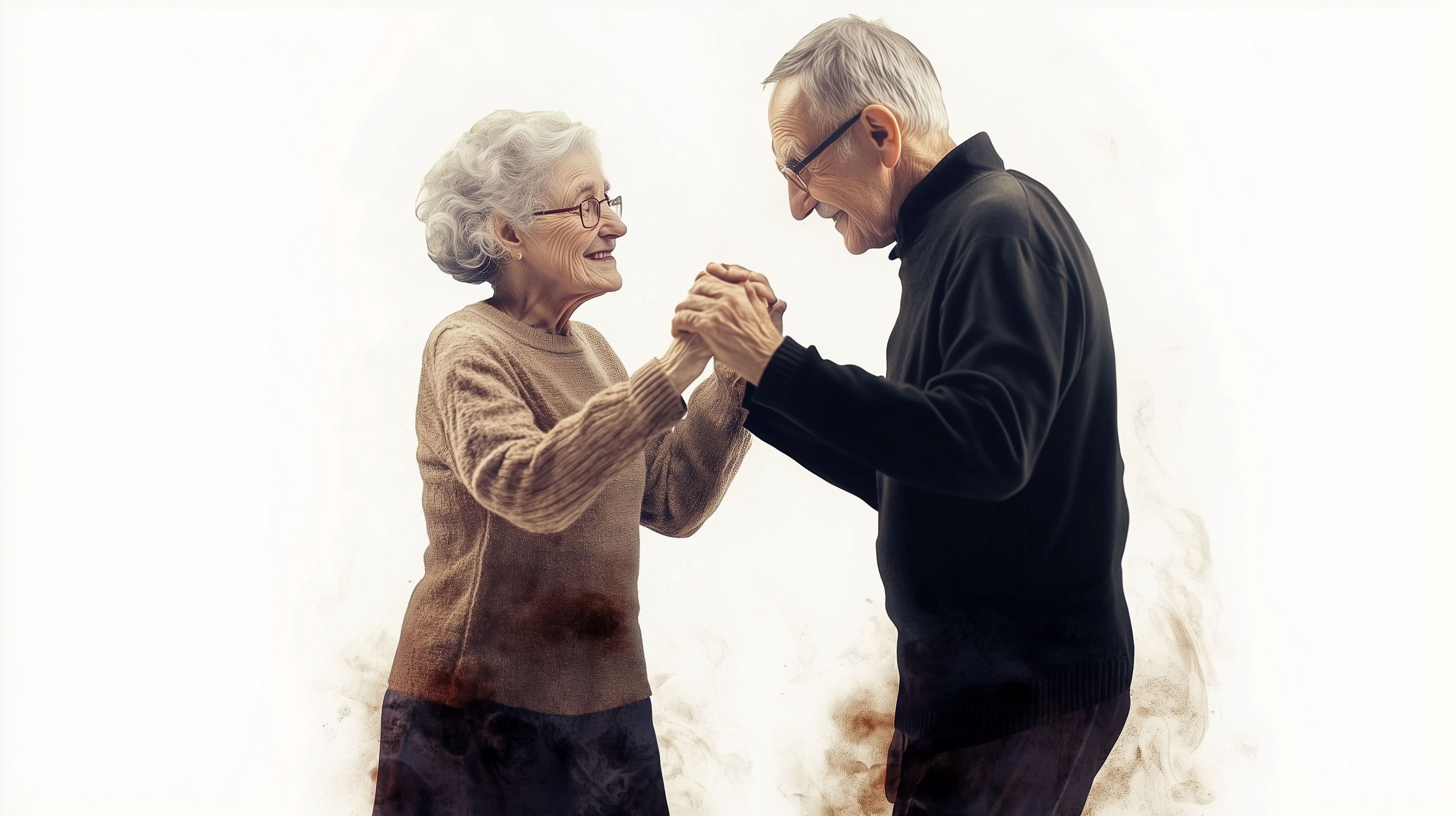 Das Bild zeigt ein älteres Ehepaar, das innig miteinander tanzt. Das Paar umarmt sich liebevoll und scheint in einem Moment reiner Freude und Vertrautheit zu schweben. Die warmen Erd- und Naturtöne, vor denen sich die beiden abheben, verleihen der Szene eine beruhigende und harmonische Atmosphäre. Dieses Foto eignet sich hervorragend als kostenloses Stockfoto für Blogs, Newsletter, Social-Media-Posts oder Werbematerial rund um Themen wie Liebe, Partnerschaft, Lebensfreude im Alter und gesunden Lebensstil. Die hochauflösende Qualität und Creative-Commons-Lizenz machen es zu einem flexibel einsetzbaren Bildmotiv.