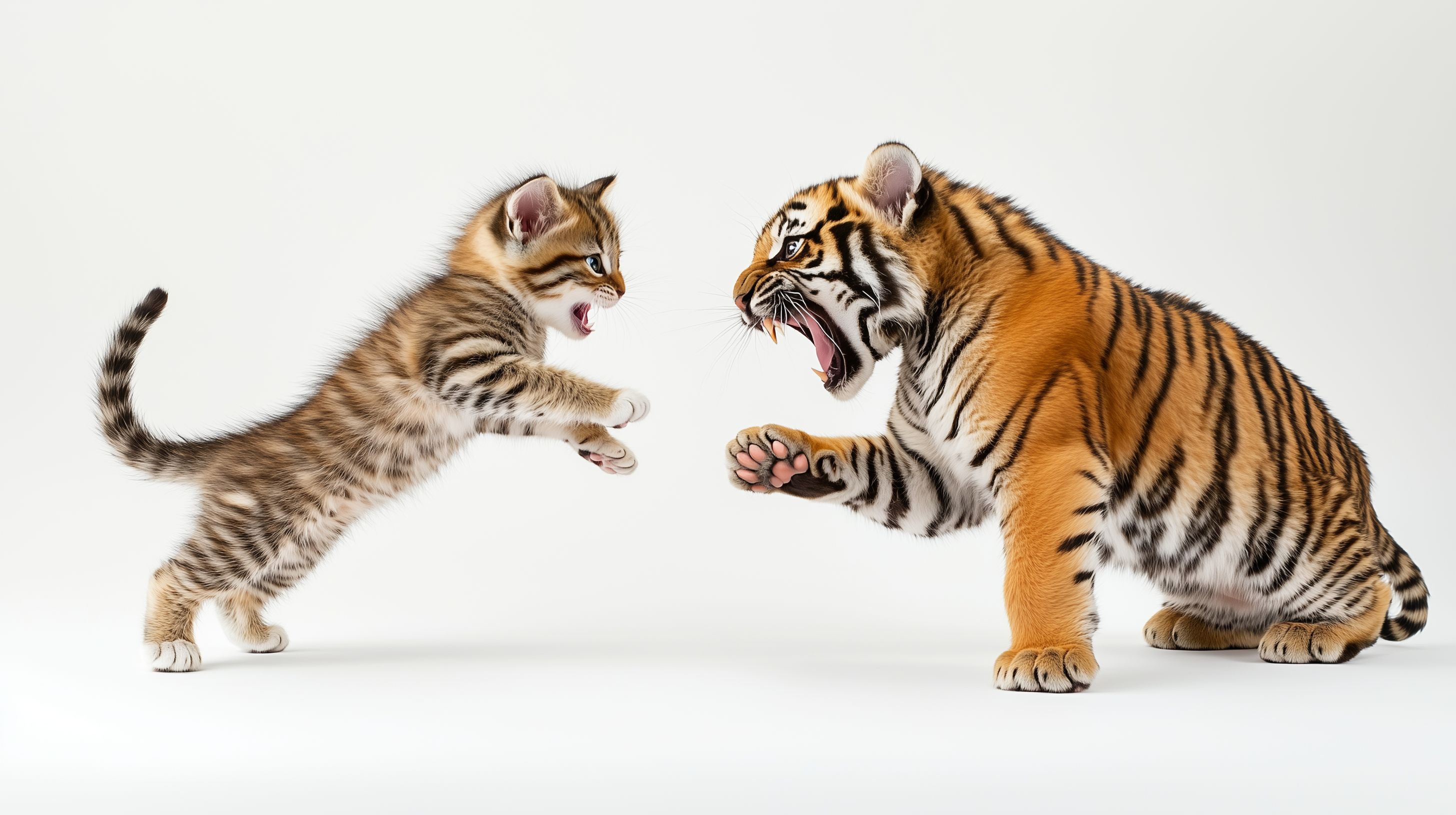 Das Bild zeigt ein junges Tigerbaby und ein Katzenjunges in einer spielerischen Auseinandersetzung. Die beiden Tiere stehen sich gegenüber, die Katze streckt eine Pfote aus, während der Tiger die Zähne zeigt. Die Szenerie vermittelt eine Mischung aus Übermut, Kraft und Freundlichkeit. Das Foto bietet viele Einsatzmöglichkeiten, etwa für Blogs über Tiere, Newsletter zum Thema Natur oder Social-Media-Beiträge rund um das Thema Haustiere. Als kostenloses Hochauflösungs-Stockfoto unter Creative-Commons-Lizenz eignet es sich hervorragend für verschiedenste visuelle Projekte.