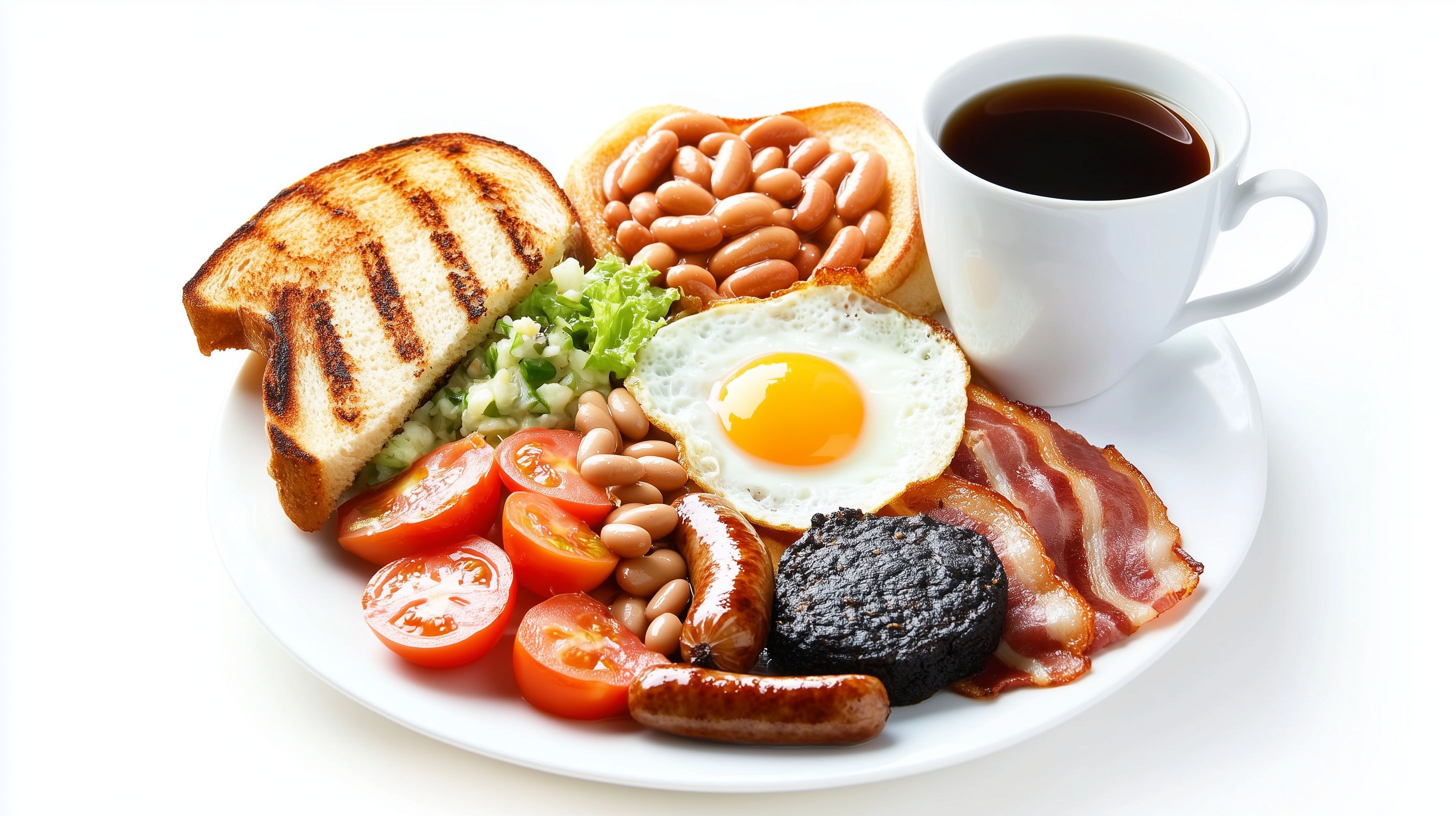 Dieses appetitliche Foto zeigt ein köstliches englisches Frühstück. In der Bildmitte steht eine weiße Keramikschale, die mit verschiedenen Zutaten gefüllt ist. Zu sehen sind frittierter Speck, ein Spiegelei, Tomaten, Baked Beans, Toasts und eine Portion Salat. Daneben ist eine Tasse schwarzer Kaffee platziert. Die Anordnung der Lebensmittel wirkt harmonisch und einladend. Das Foto hat eine natürliche, rustikale Atmosphäre und könnte perfekt für Blogs, Newsletter, Social-Media-Kanäle oder Werbezwecke eingesetzt werden. Als hochauflösendes Stockfoto unter einer Creative-Commons-Lizenz ist es kostenfrei für viele Einsatzzwecke verfügbar.