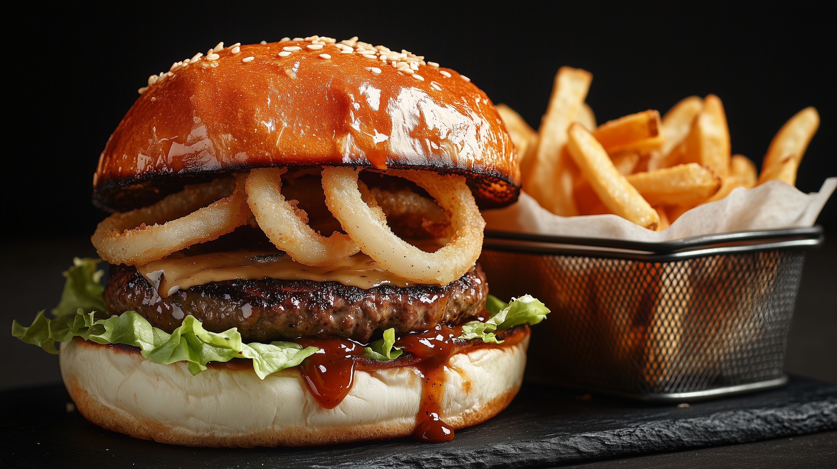 Das Bild zeigt einen leckeren Cheeseburger mit einem saftigen Patty, geschmolzenem Käse, knusprigen Zwiebelringen und knackigem Salat, serviert auf einem goldbraunen Brötchen. Dazu sind frisch zubereitete, knusprige Pommes frites in einem schwarzen Behälter angerichtet. Die Darstellung in dunkler Umgebung verleiht dem Gericht eine appetitliche, rustikale Optik. Dieses Stockfoto eignet sich perfekt für Food-Blogs, Restaurantwebsites, Social-Media-Beiträge oder Werbematerialien im gastronomischen Bereich. Es ist in hoher Auflösung verfügbar und unter einer kostenlosen Creative-Commons-Lizenz nutzbar.