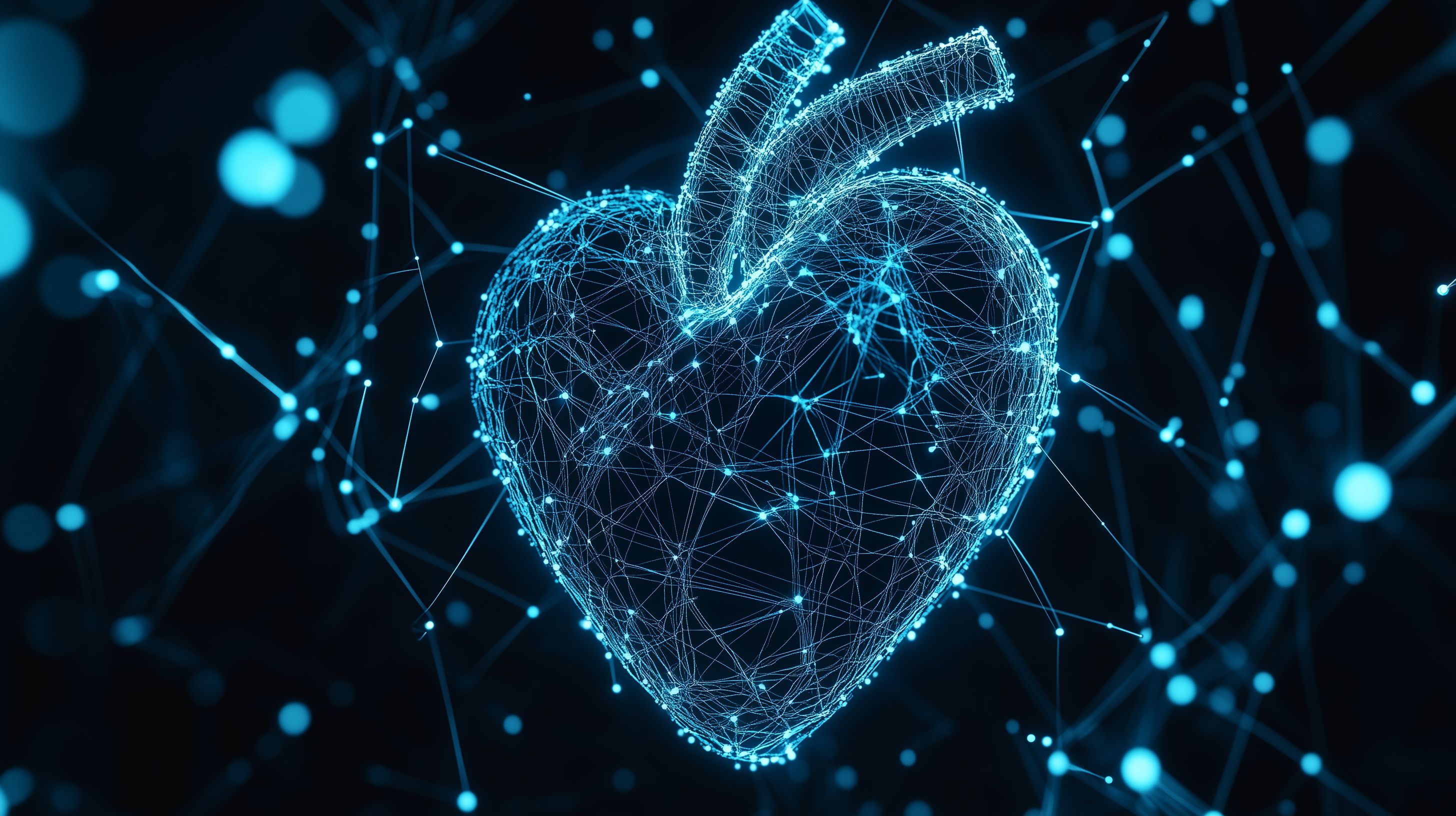 Das Bild zeigt ein futuristisches digitales Herzsymbol in Blautönen. Es besteht aus einem Netz aus leuchtenden Linien und Punkten, die die Form eines Herzens formen. Der Hintergrund ist dunkel, wodurch die blauen Elemente besonders hervorstechen und einen technologischen, wissenschaftlichen Eindruck vermitteln. Dieses Stockfoto eignet sich hervorragend für den Einsatz in Medizin- und Gesundheitsthemen, aber auch für Werbung und Präsentationen mit einem Hightech-Fokus. Das Bild ist in hoher Auflösung und unter einer Creative-Commons-Lizenz verfügbar.