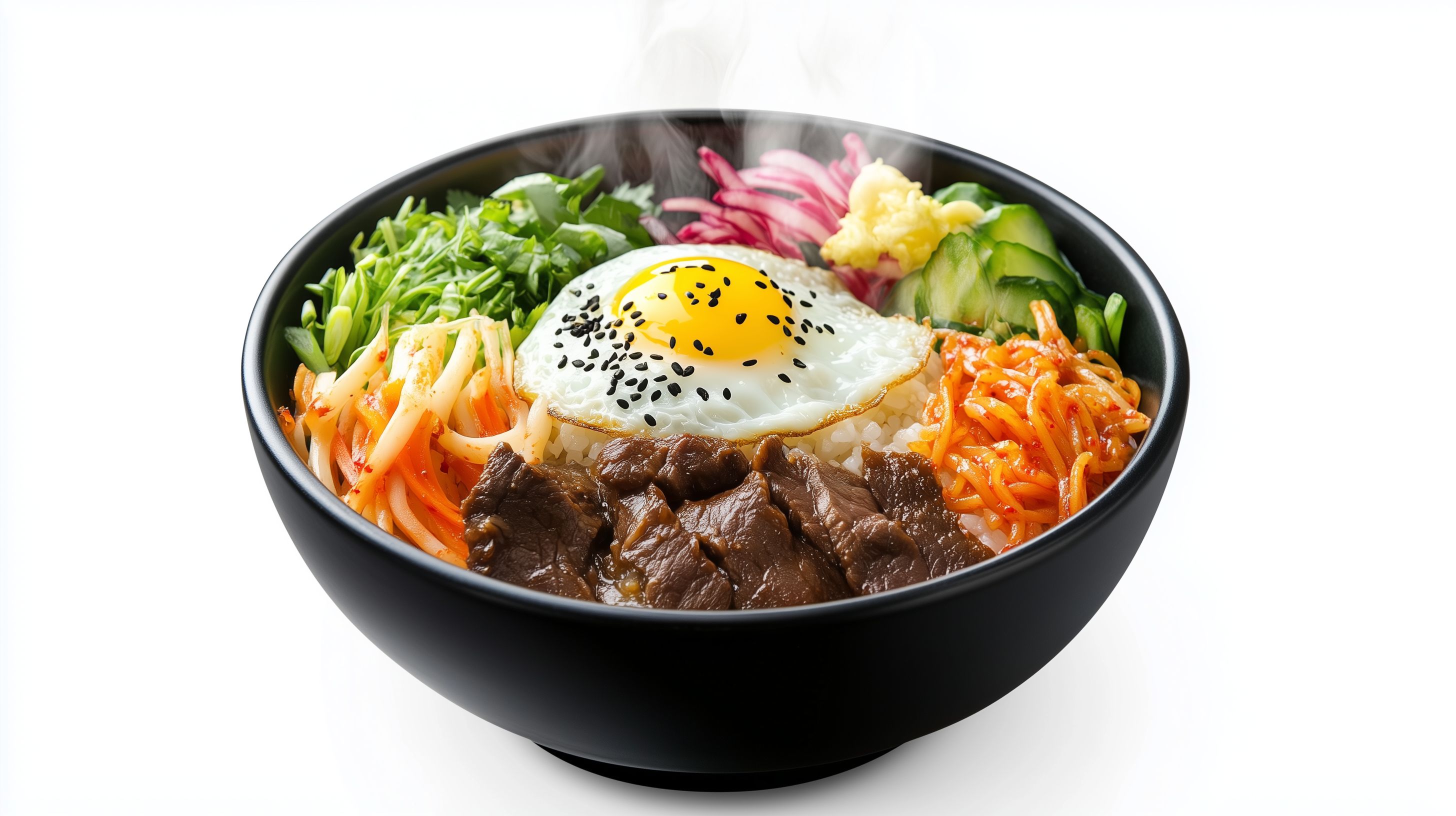 Dieses Foto zeigt ein traditionelles koreanisches Bibimbap-Gericht. Es besteht aus einer Schale mit Reis, darauf angeordnet sind verschiedene frisch zubereitete Zutaten wie Rindfleisch, Spiegelei, Karotte, Gurke, Lauch und Sesam. Das Gericht zeichnet sich durch seine farbenfrohe und appetitliche Präsentation aus. Es ist ein leckeres und nahrhaftes Mittagessen, das typisch für die asiatische Küche ist. Dieses hochwertige Stockfoto in hoher Auflösung eignet sich perfekt für Rezeptblogs, Kochportale, Werbekampagnen und andere Verwendungen unter der Creative-Commons-Lizenz.