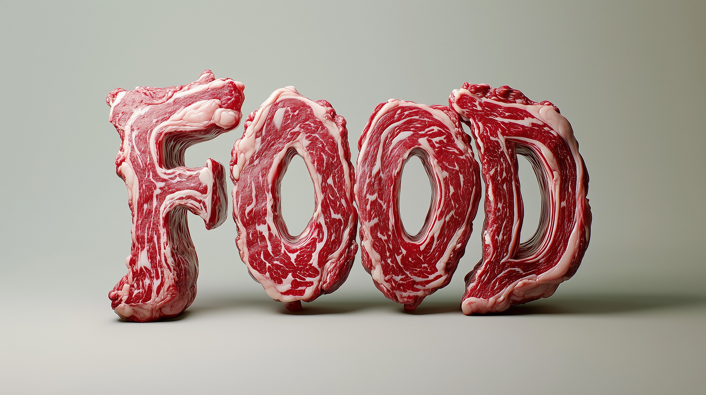Dieses Foto zeigt ein hyperrealistisches Arrangement von Fleischstücken, die das Wort 'FOOD' bilden. Die Fleischstücke sind detailliert dargestellt, mit sichtbaren Fasern und Marmorierung, was ihnen eine sehr natürliche Optik verleiht. Die kräftige rote Farbe des Fleisches sowie die dramatische Beleuchtung und der neutrale Hintergrund lassen die Buchstaben-Komposition besonders auffällig und eindrucksvoll erscheinen.
