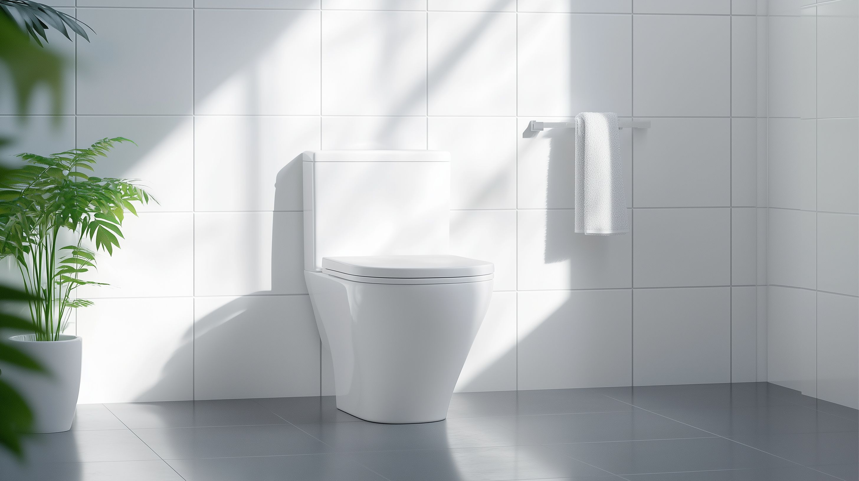 Dieses Foto zeigt ein minimalistisches, modern gestaltetes Badezimmer. Im Mittelpunkt steht eine weiße Keramiktoilette, umgeben von hellen Fliesen an den Wänden. Neben der Toilette steht eine große, saftig-grüne Zimmerpflanze, die dem Raum einen natürlichen Akzent verleiht. Das Badezimmer ist von viel Tageslicht durchflutet, das durch die großen Fenster hereinkommt und eine angenehme, entspannende Atmosphäre schafft. Dieses Stockfoto in hoher Auflösung eignet sich ideal für Verwendungen in Blogs, Newslettern, Social-Media-Beiträgen oder Werbeanzeigen, die ein modernes, minimalistisches Badezimmer-Ambiente präsentieren möchten. Das Foto steht unter einer Creative-Commons-Lizenz zur kostenlosen Nutzung zur Verfügung.