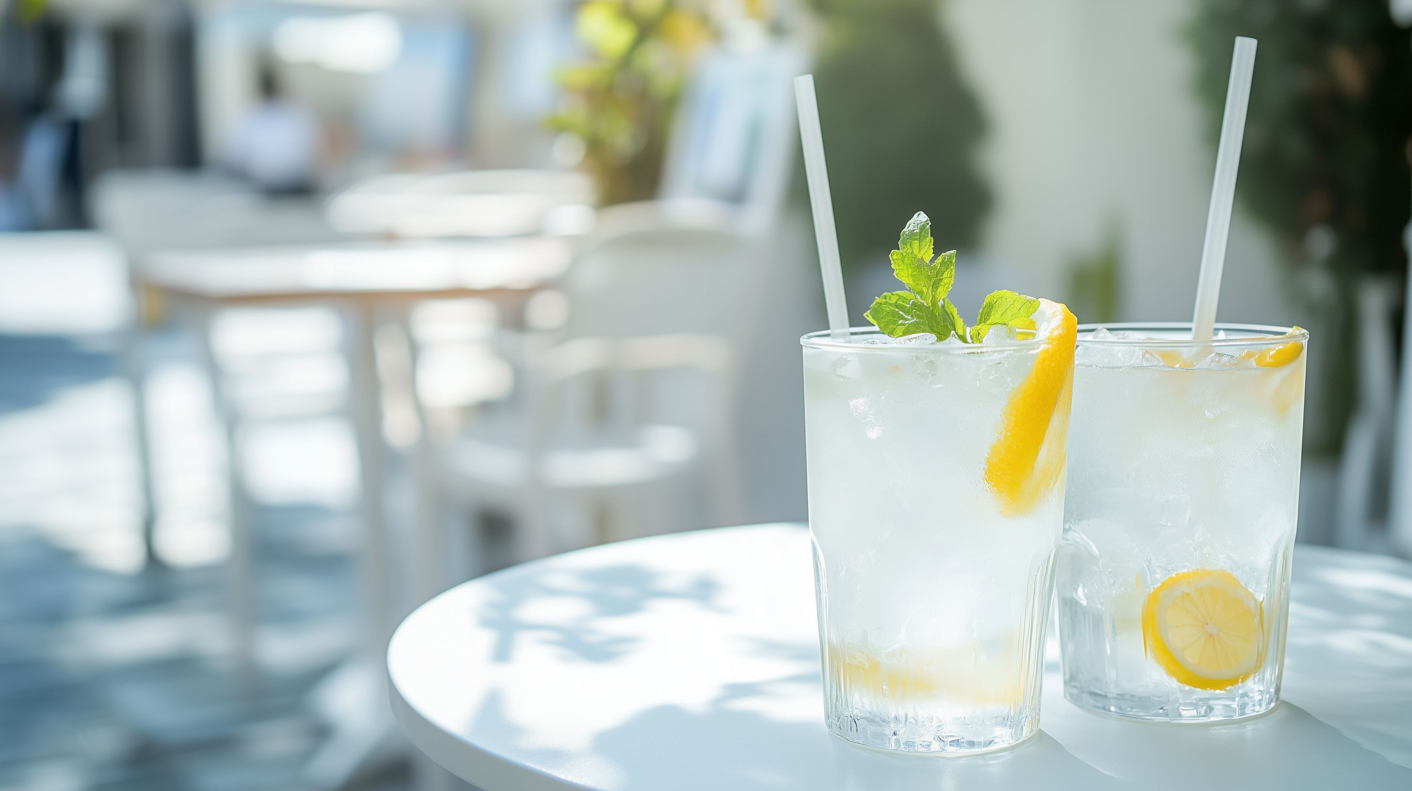 Das Bild zeigt zwei erfrischende Sommergetränke auf einem weißen Bistrotisch in einem Outdoor-Cafe-Ambiente. Die Getränke sind mit Eiswürfeln, Zitronenscheiben und grünen Minzblättern dekoriert, was ihnen ein frisches und einladendes Aussehen verleiht. Die Szene vermittelt eine entspannte, sommerliche Stimmung und lässt den Betrachter den Wunsch verspüren, selbst einen solchen erfrischenden Drink zu genießen. Dieses hochauflösende, kostenlose Stockfoto eignet sich hervorragend für den Einsatz in Blogs, Newslettern, Social-Media-Beiträgen oder Werbematerialien, die einen sonnigen, sommerlichen Charakter vermitteln möchten.