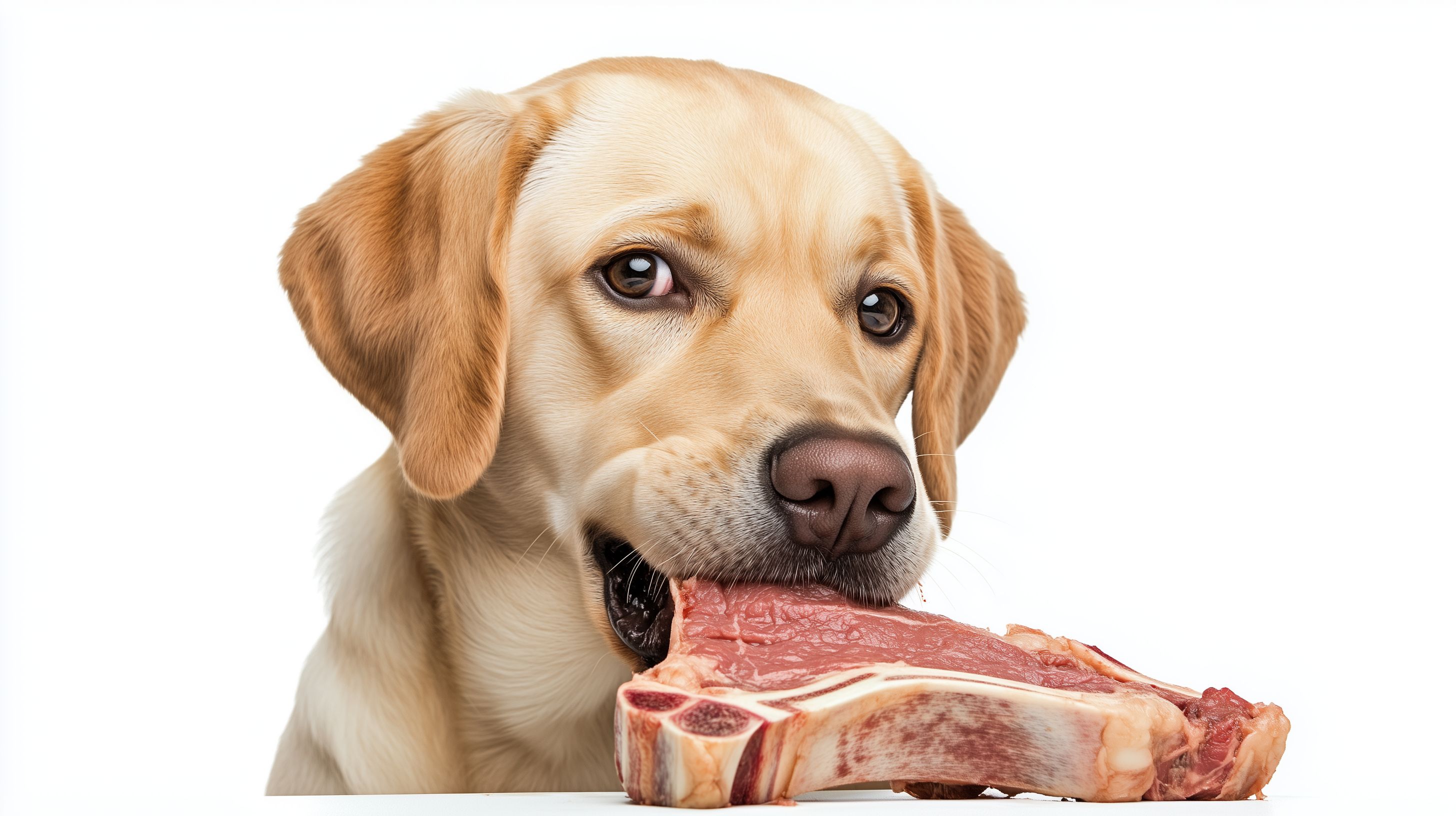 Das Bild zeigt einen jungen, hellbraunen Labrador, der sehnsüchtig auf ein rohes Fleischstück blickt und es mit seinem Maul zu ergreifen versucht. Der Hund hat einen intensiven, fast hungrigen Blick, der seine Freude an dem Fleischgericht deutlich zum Ausdruck bringt. Das Foto ist in einem neutralen, weißen Hintergrund aufgenommen, wodurch der Fokus ganz auf dem Hund und seinem Futter liegt. Dieses stimmungsvolle Bild eignet sich hervorragend als kostenloses Stockfoto für Beiträge rund um Haustiere, Ernährung oder auch Fotografie in hoher Auflösung unter Creative-Commons-Lizenz.