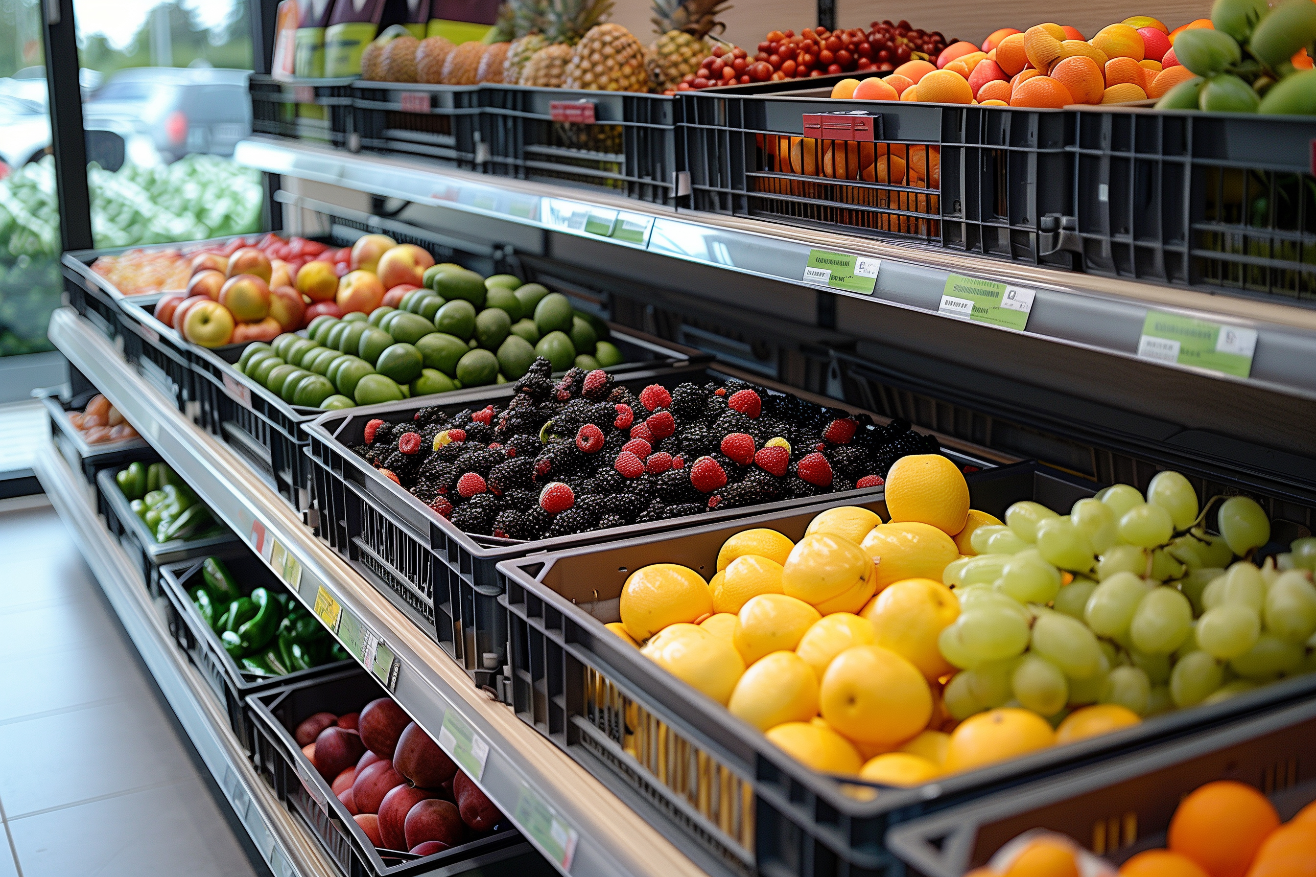 Das Bild zeigt eine Auswahl an verschiedenen tropischen Früchten auf den Regalen eines Supermarktes oder Gemüseladens. Das Arrangement ist sehr farbenfroh und einladend, mit bunten Orangen, Mangos, Ananas, Kirschen, Beeren und anderen Früchten. Die Perspektive ist frontal, so dass der Betrachter einen guten Überblick über das Sortiment erhält. Die Früchte sind in Kisten und Kästen präsentiert, was einen professionellen und hochwertigen Eindruck vermittelt. Dieses Foto eignet sich hervorragend für den Einsatz in Blogbeiträgen, Newslettern, Social-Media-Posts oder Werbematerialien zum Thema gesunde Ernährung, Rezeptideen oder Lebensmittelverkauf. Als kostenloses Stockfoto in hoher Auflösung und unter einer Creative-Commons-Lizenz verfügbar, kann es vielseitig und flexibel genutzt werden.
