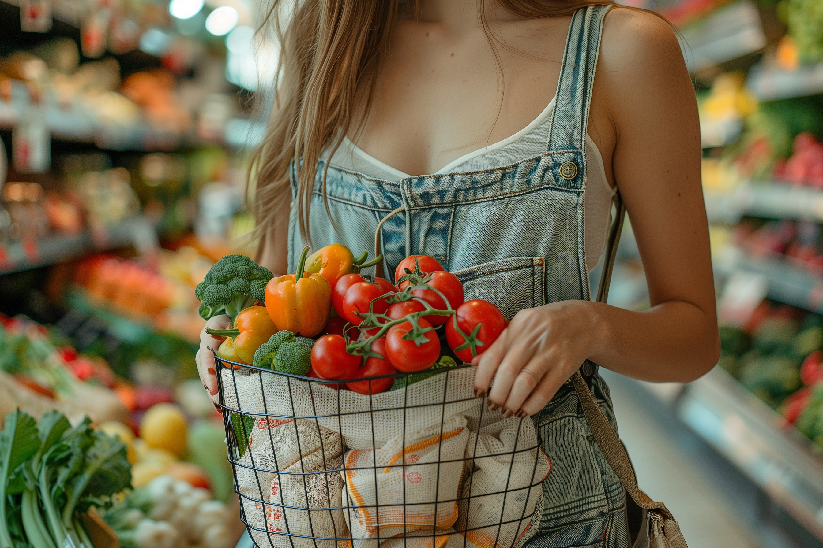 Das Foto zeigt eine junge Frau, die einen Einkaufskorb voller bunter, frischer Gemüsesorten wie Tomaten, Paprika und Broccoli in einem Supermarkt trägt. Sie ist in lässige, verwaschene Jeans-Latzhosen gekleidet, was einen natürlichen, bodenständigen Eindruck vermittelt. Die Szene strahlt Frische, Gesundheit und Nachhaltigkeit aus und eignet sich hervorragend als kostenloses Stockfoto für Blogs, Newsletter, Social-Media-Beiträge oder Werbematerialien rund um die Themen Ernährung, Kochen und gesunder Lebensstil. Die hochwertige Auflösung und Creative-Commons-Lizenz ermöglichen eine flexible Verwendung in verschiedensten Kontexten.
