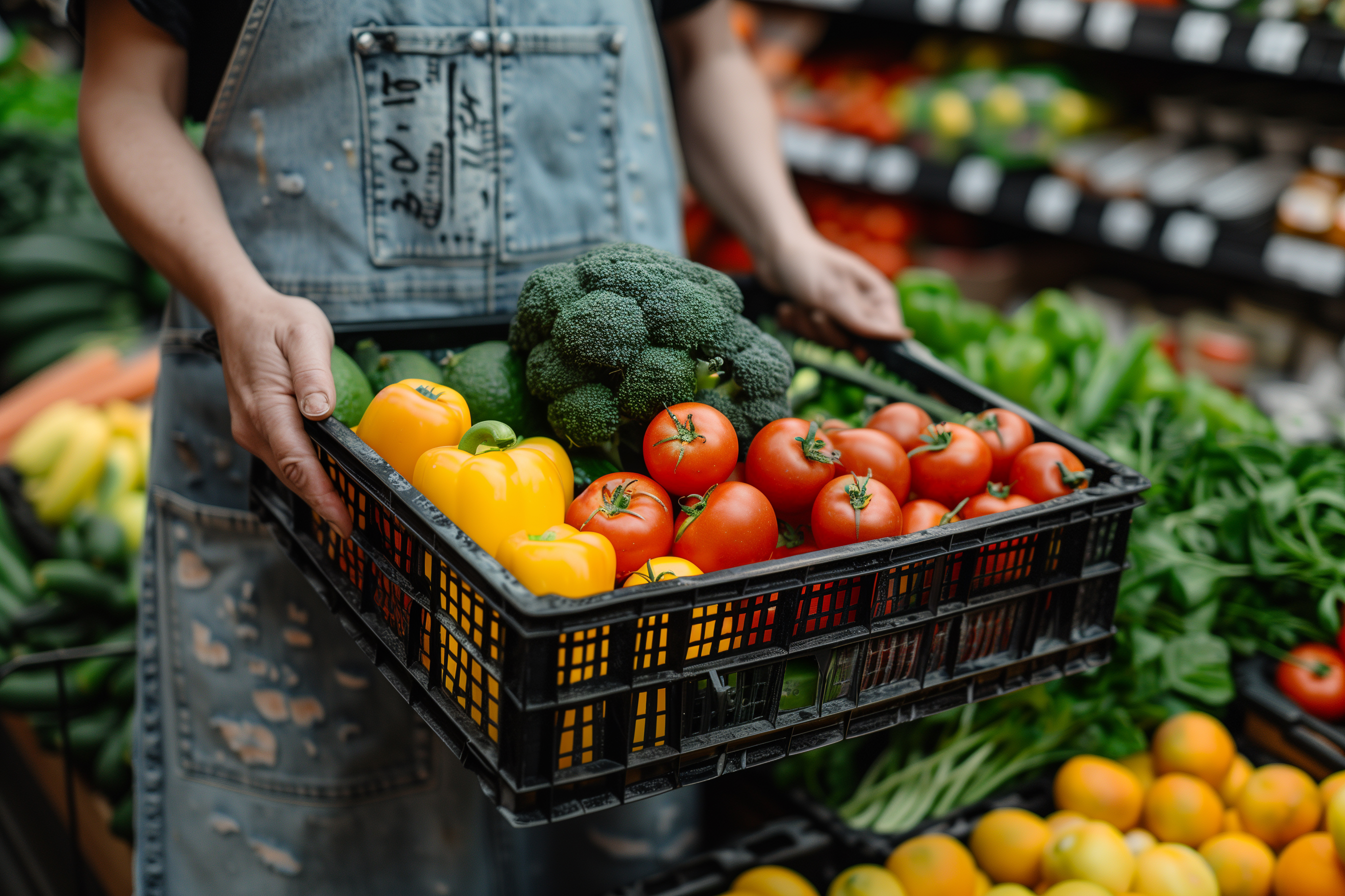 Das Foto zeigt eine Auswahl an frischem Bio-Gemüse und -Obst, die in Kisten auf den Regalen eines Supermarkts präsentiert werden. Die Kisten sind mit verschiedenfarbigem Gemüse wie Tomaten, Paprika, Brokkoli und grünem Salat gefüllt, was einen lebendigen und appetitlichen Eindruck vermittelt.
