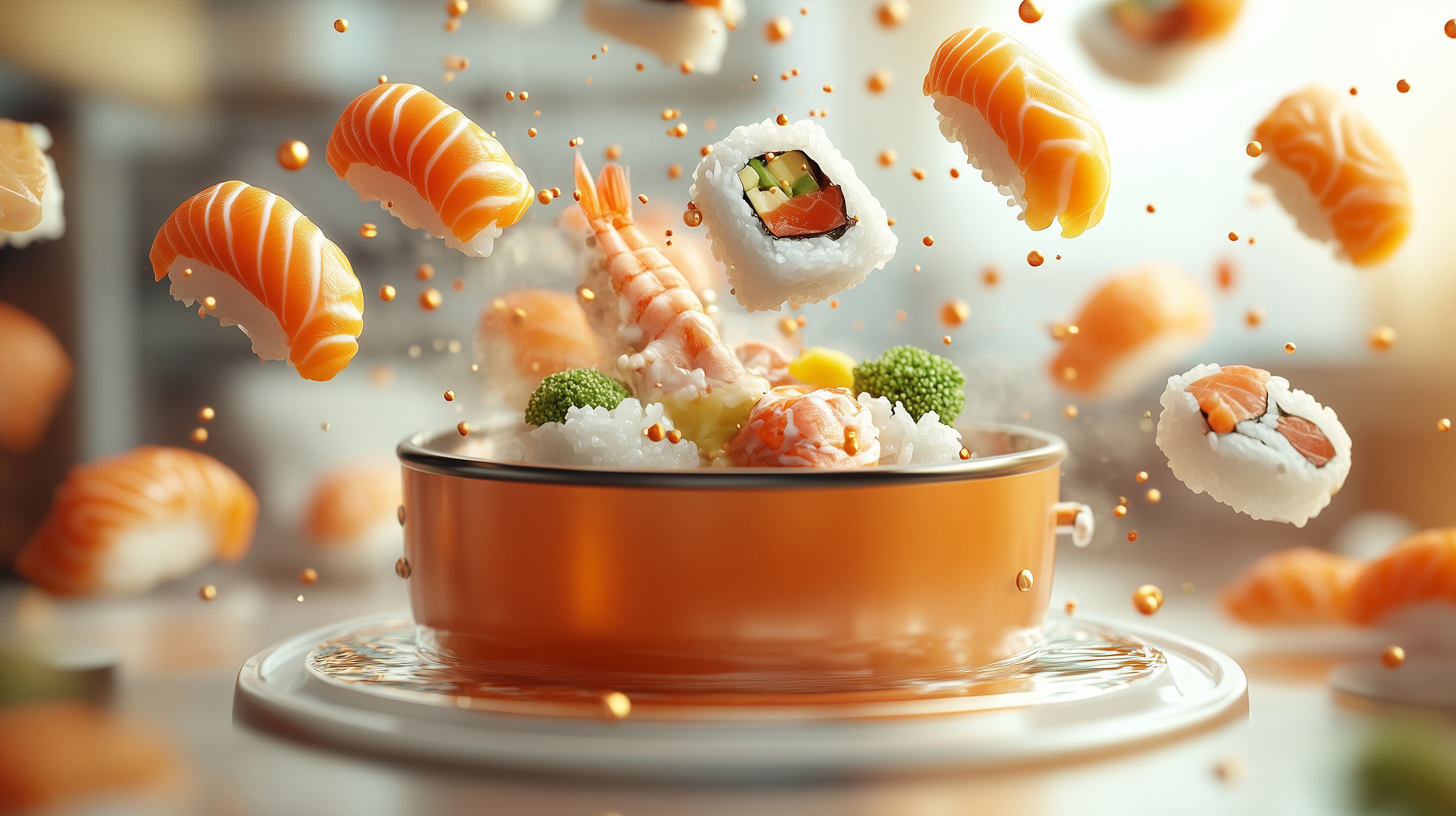 Dieses kreative und appetitlich anmutende Sushi-Arrangement in 3D-Optik ist perfekt für den Einsatz in Blogs, Newslettern, Social-Media-Beiträgen oder Werbekampagnen zum Thema japanische Küche, Lebensmittel oder Gastronomie. Die Aufnahme zeigt eine Vielzahl an Sushi-Varianten - vom Lachs-Nigiri über Maki-Rollen bis hin zu Garnelen-Tempura - die in einer schwebenden, dynamischen Komposition präsentiert werden. Der Spritzeneffekt und der Eindruck von Schwerelosigkeit verleihen dem Bild einen besonderen, kreativen Touch. Dieses hochwertige Stockfoto in hoher Auflösung steht unter Creative-Commons-Lizenz zum kostenlosen Download zur Verfügung.