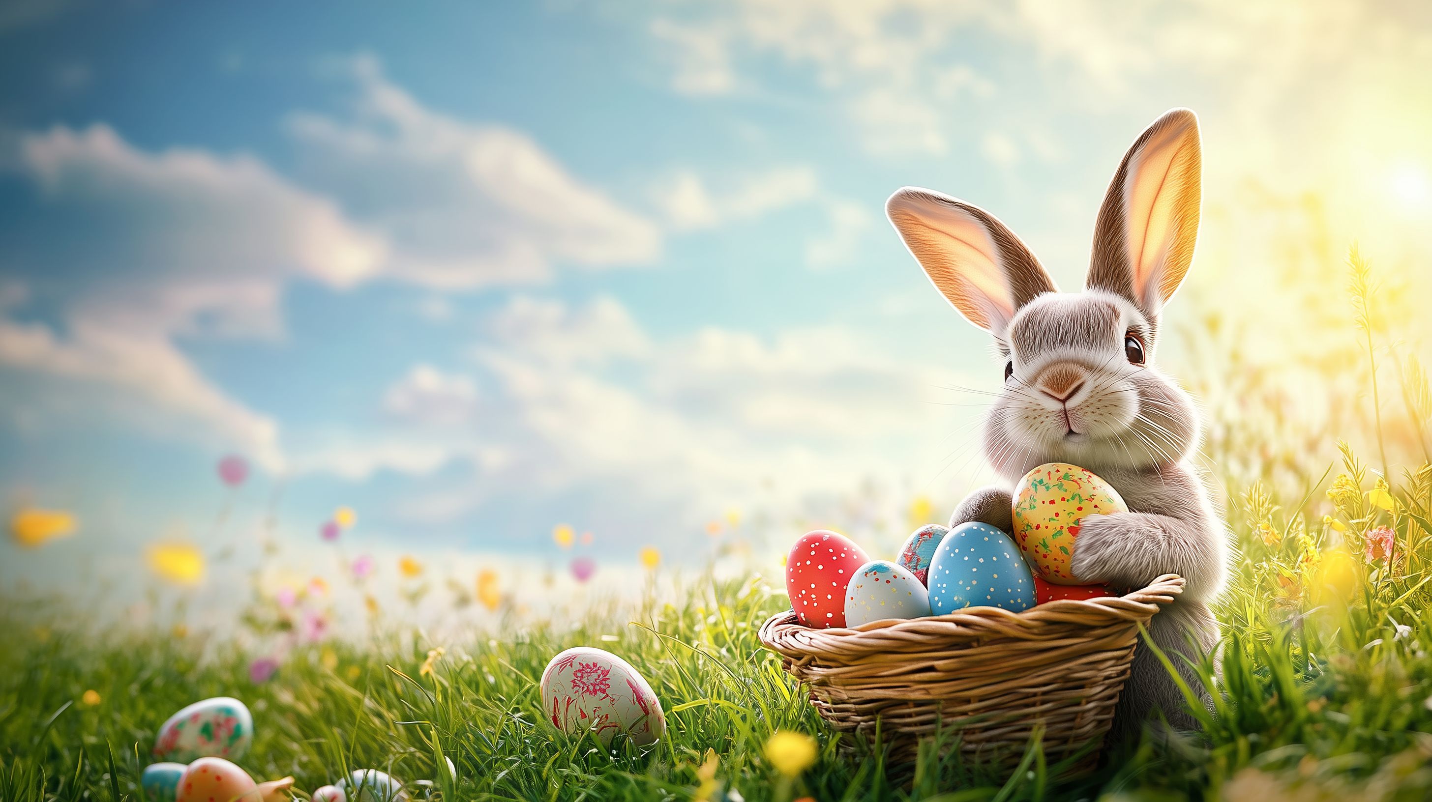 Das Bild zeigt einen niedlichen Osterhasen, der auf einer blühenden Frühlingswiese sitzt und einen Korb voller bunt bemalter Ostereier vor sich hat. Im Hintergrund ist ein strahlend blauer Himmel mit vereinzelten Wolken zu sehen, die eine idyllische Stimmung verleihen. Die Szene wirkt friedlich und einladend, perfekt für Ostergrüße, Frühlings-Dekorationen oder Werbemotive rund um die Osterzeit. Dieses hochauflösende Stockfoto ist unter einer Creative-Commons-Lizenz frei verfügbar und kann für verschiedenste Projekte, wie Blogs, Newsletter, Social-Media-Beiträge oder Werbekampagnen, kostenlos genutzt werden.