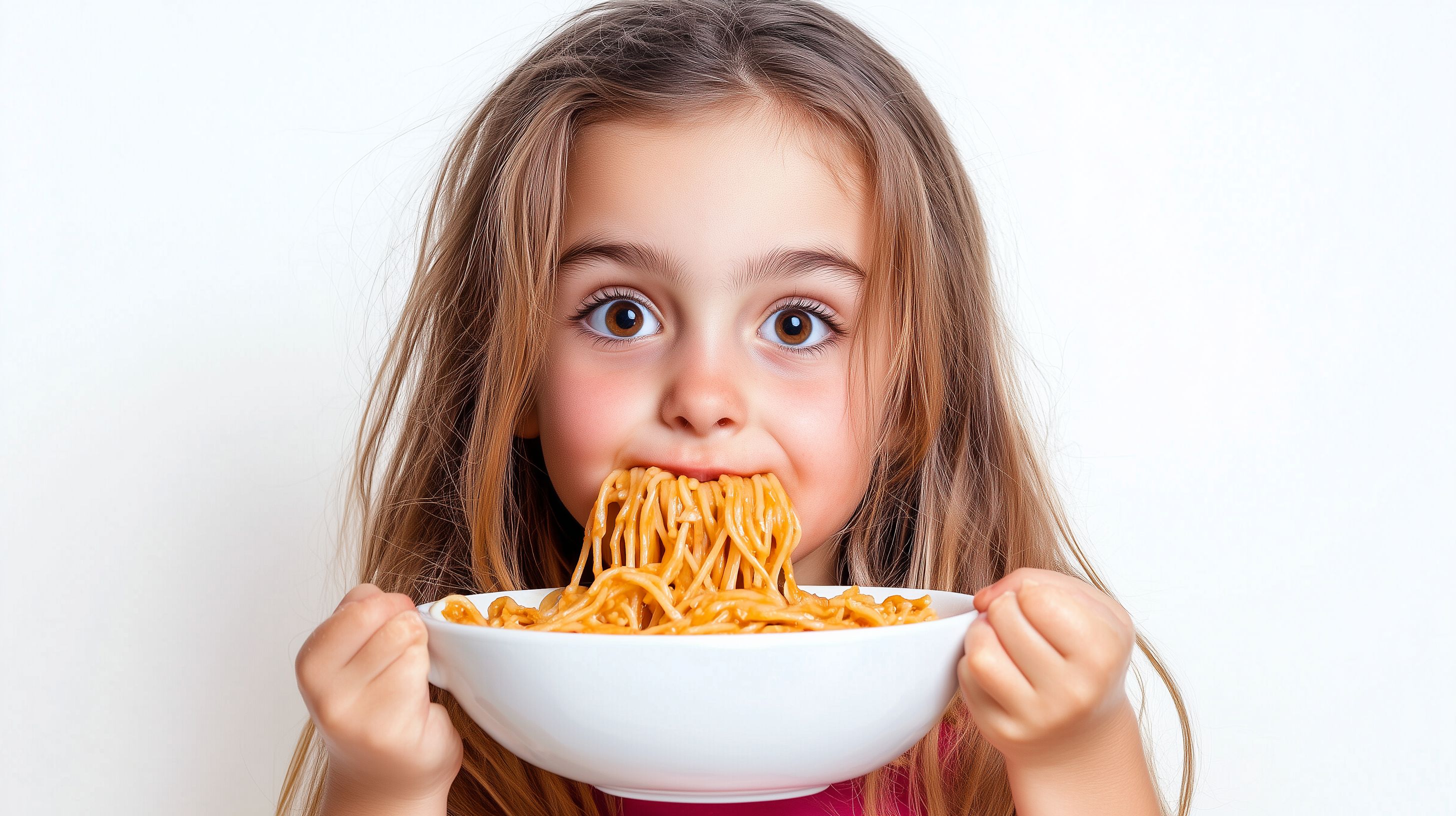 Das Foto zeigt ein fröhliches, junges Mädchen, das eine Portion Spaghetti genießt. Mit großen Augen und einem breiten Lächim im Gesicht hält sie eine Gabel voller Nudelstränge vor sich, bereit diese in sich aufzunehmen. Die leuchtend orangenen Nudeln bilden einen schönen Kontrast zu dem weißen Hintergrund und verleihen dem Bild eine natürliche, appetitanregende Atmosphäre. Dieses kostenlose Stockfoto in hoher Auflösung eignet sich hervorragend für den Einsatz in Blogs, Newslettern, Social-Media-Beiträgen oder Werbekampagnen rund um das Thema Essen und Genuss. Die Lizenz unter Creative Commons erlaubt eine vielfältige Nutzung des Motivs.