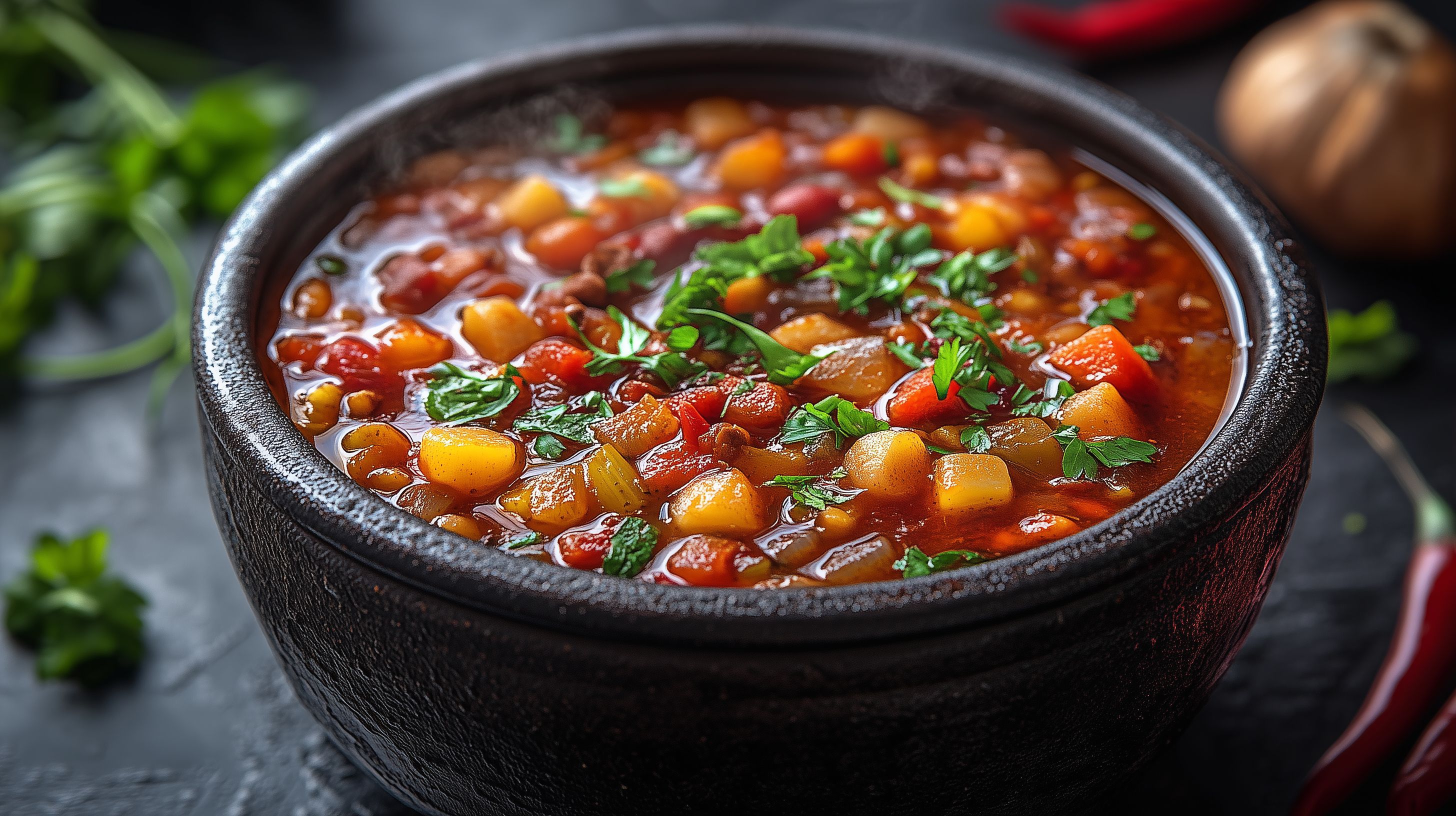 Dieses Foto zeigt einen appetitlichen Gemüse-Eintopf in einer rustikalen Keramikschale. Der dampfende Eintopf ist gefüllt mit bunten Gemüsestücken wie Paprika, Kartoffeln und Kräutern, die eine schöne Farbkomposition ergeben. Der Topf steht auf einem dunklen Holztisch, was dem Bild eine warme, gemütliche Stimmung verleiht. Dieses Foto ist ideal für den Einsatz in Blogs, Newslettern oder auf Social-Media-Kanälen, um Appetit auf ein leckeres, selbstgemachtes Gericht zu wecken. Als kostenloses Stockfoto in hoher Auflösung und unter Creative-Commons-Lizenz kann es vielfältig genutzt werden.