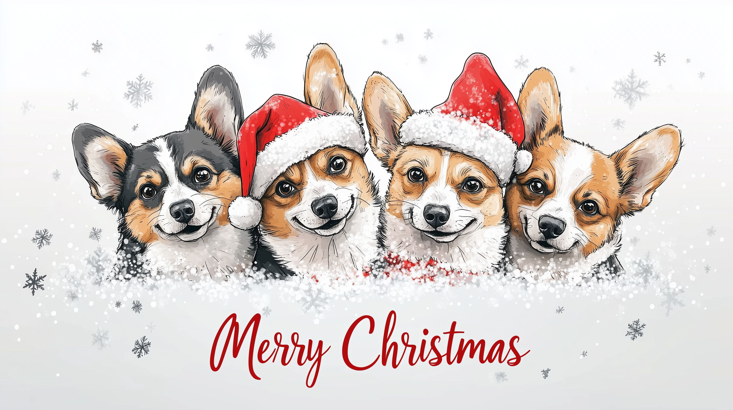 Das Bild zeigt eine Gruppe von fünf entzückenden Corgis, die in Weihnachtsmützen gekleidet sind und fröhlich in den Schnee blicken. Die Komposition ist sehr stimmungsvoll, mit einem Hintergrund aus fallenden Schneeflocken und einem freundlichen, roten Schriftzug 'Merry Christmas'. Die lebendige Darstellung der Hunde, ihre niedlichen Gesichtsausdrücke und die festliche Winteratmosphäre machen dieses Motiv zu einem perfekten kostenlosen Stockfoto für die Verwendung in Blogs, Grußkarten, Social-Media-Beiträgen oder Weihnachtsdekorationen in hoher Auflösung und unter der Creative-Commons-Lizenz. Das Bild vermittelt eine fröhliche, weihnachtliche Stimmung und eignet sich hervorragend als Gestaltungselement für Ihre Weihnachtskampagnen.