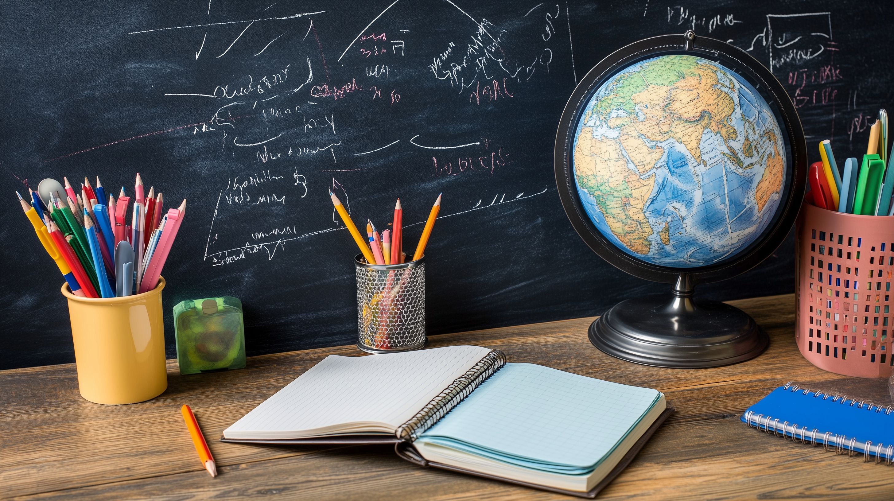 Dieses Bild zeigt eine kreative und inspirierende Lernumgebung. Im Vordergrund sehen wir verschiedene Schulmaterialien wie bunte Stifte, Notizbücher und einen Stifthalter auf einem Holztisch. Im Hintergrund befindet sich eine schwarze Tafel, auf der Formeln und Notizen zu sehen sind. Der Mittelpunkt des Bildes ist ein detaillierter Globus, der die globale Perspektive und den Horizont der Schüler erweitert.