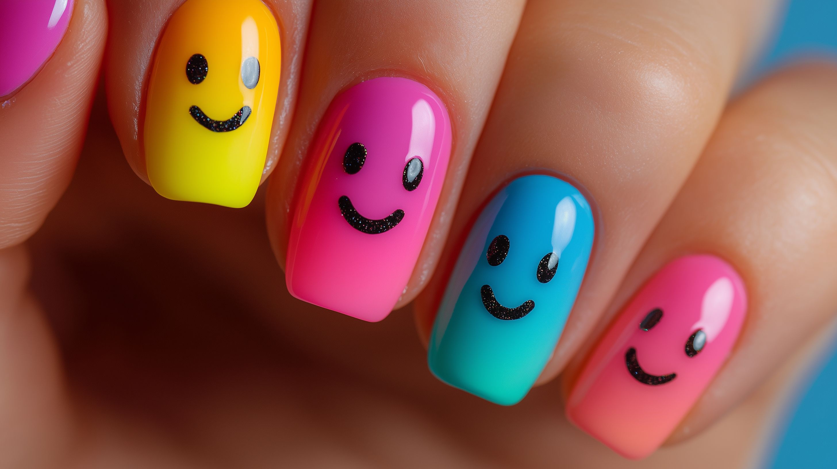 Das Bild zeigt eine kreative und farbenfrohe Maniküre mit verschiedenen Nagelaufklebern in Form von lächelnden Emojis. Die Nägel sind in leuchtenden Farben wie Gelb, Pink, Türkis und Blau lackiert und die Emoji-Gesichter sind mit schwarzen Linien detailreich gestaltet. Diese einzigartige Nail-Art ist ein echter Hingucker und verleiht den Händen einen fröhlichen, verspielten Look. Das Foto eignet sich hervorragend für den Einsatz in Blogs, Newslettern oder Social-Media-Beiträgen rund um das Thema Schönheit, Beauty und kreative Nagelpflege. Dieses hochauflösende Stockfoto ist unter einer Creative-Commons-Lizenz kostenlos für private und kommerzielle Zwecke nutzbar.