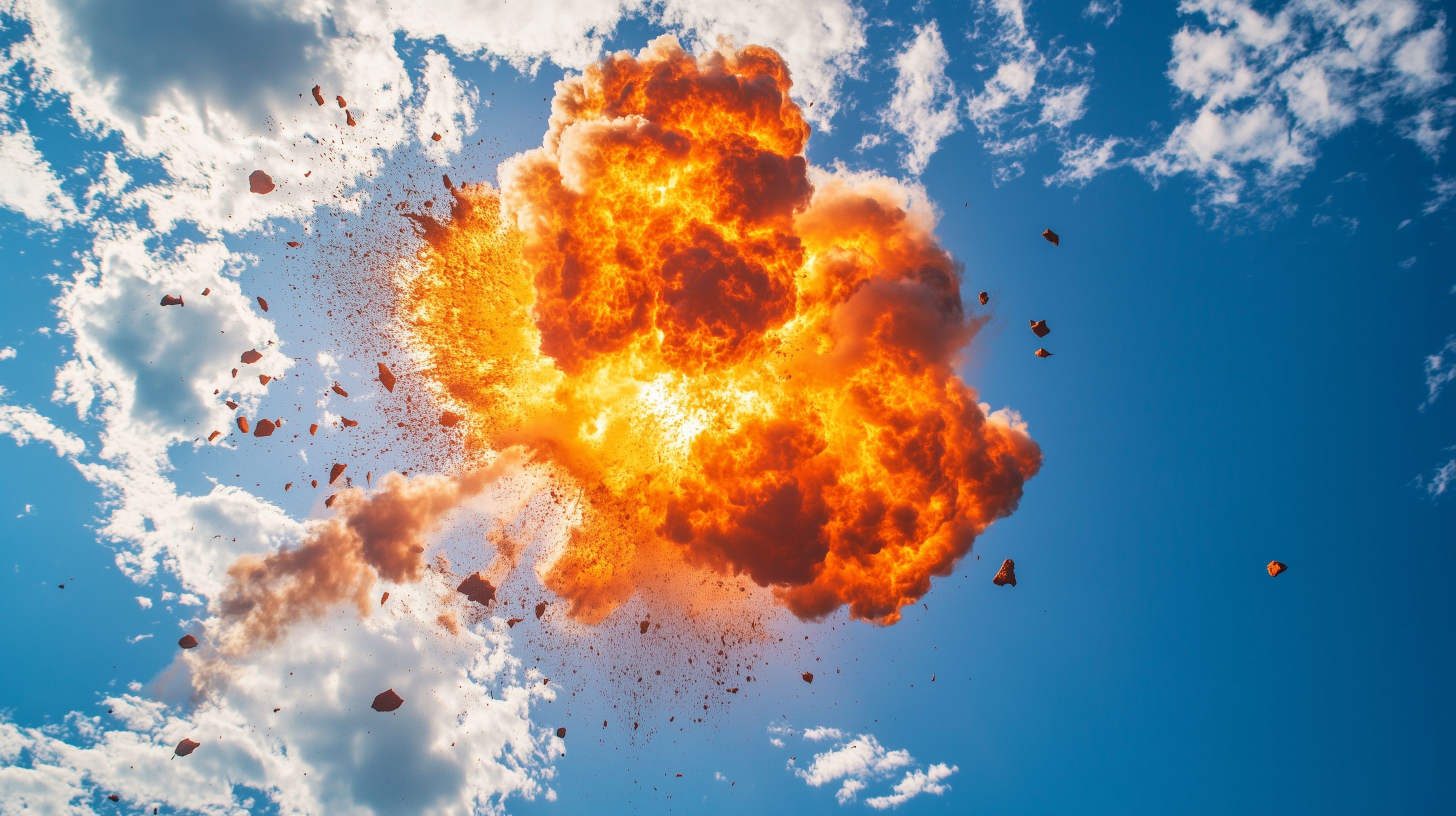 Dieses beeindruckende Foto zeigt eine gewaltige Explosion am Himmel. Eine riesige, orangefarbene Feuerwolke breitet sich gegen einen dramatischen, bewölkten Hintergrund aus. Die Detonation lässt zahlreiche Partikel und Trümmerteile umherfliegen. Das Bild strahlt eine enorme Energie und Dynamik aus und ist perfekt für Anwendungen in den Bereichen Action, Krieg, Katastrophen oder explosionsartige Ereignisse geeignet. Als kostenloses Stockfoto in hoher Auflösung unter Creative-Commons-Lizenz kann es vielfältig in Blog-Beiträgen, Newslettern, Werbematerialien oder sozialen Medien eingesetzt werden.