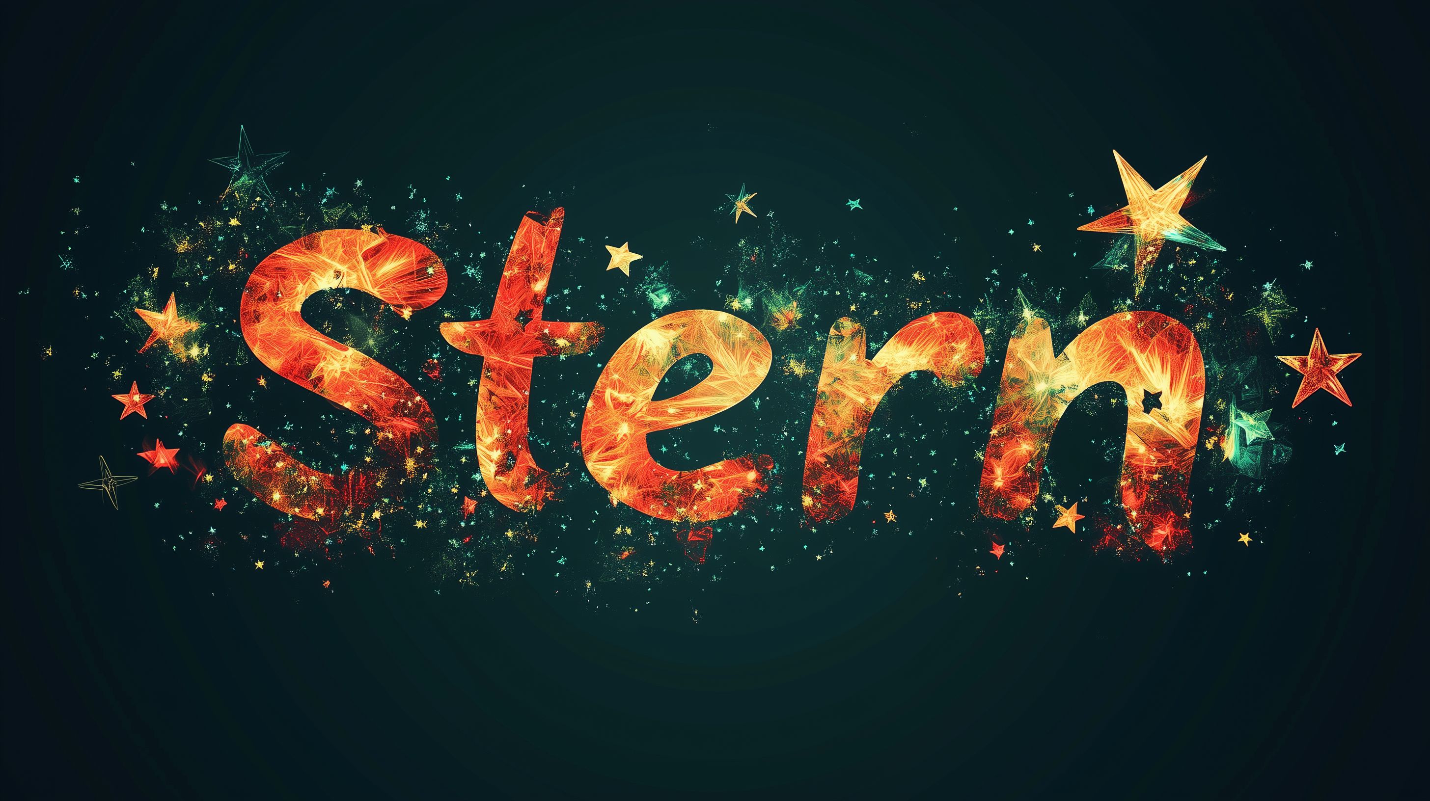 Dieses dramatische Foto zeigt eine kreative Darstellung des Wortes 'Stern', das aus leuchtenden Sternengrafiken geformt ist. Vor einem dunklen Nachthintergrund erscheinen die feurig-funkelnden Sternensymbole wie ein Feuerwerksschauer, der den Betrachter in eine geheimnisvolle, gehobene Stimmung versetzt. Die Komposition ist ausgewogen und die Farbgestaltung in warmen, kontrastreichen Tönen sehr ansprechend.