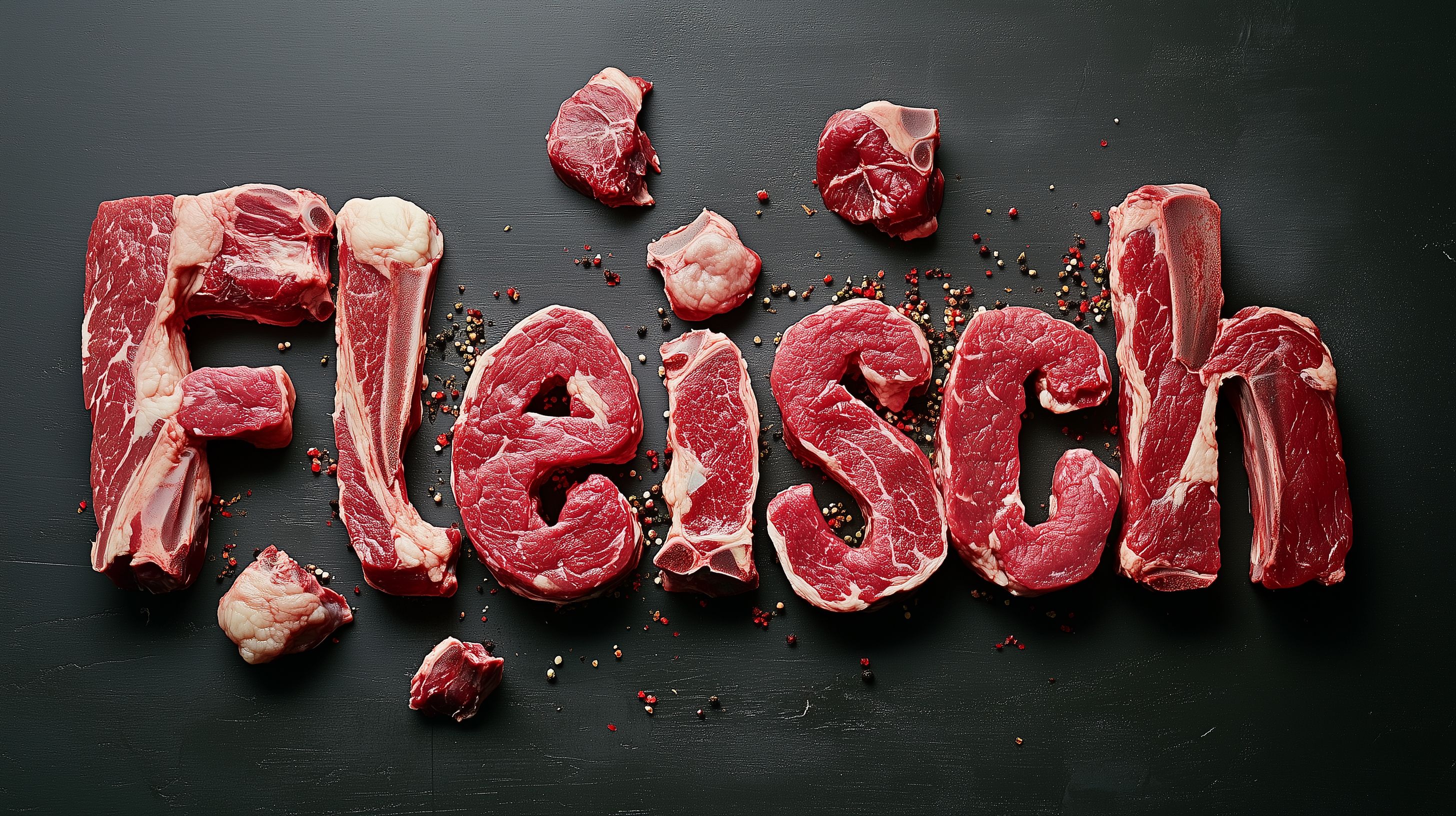 Dieses Bild zeigt verschiedene Fleischstücke auf einem dunklen Untergrund. Die roten, rohen Fleischstücke sind mit Gewürzen wie Pfeffer bestreut und vermitteln einen rustikalen, natürlichen Look. Die Anordnung der Fleischstücke in unterschiedlichen Größen und Formen ergibt ein interessantes visuelles Muster. Dieses Foto eignet sich hervorragend als Stockfoto für Rezepte, Kochbücher, Gastronomie-Werbung oder andere kulinarische Anwendungen. Das hochauflösende Bild ist kostenfrei unter einer Creative-Commons-Lizenz verfügbar.