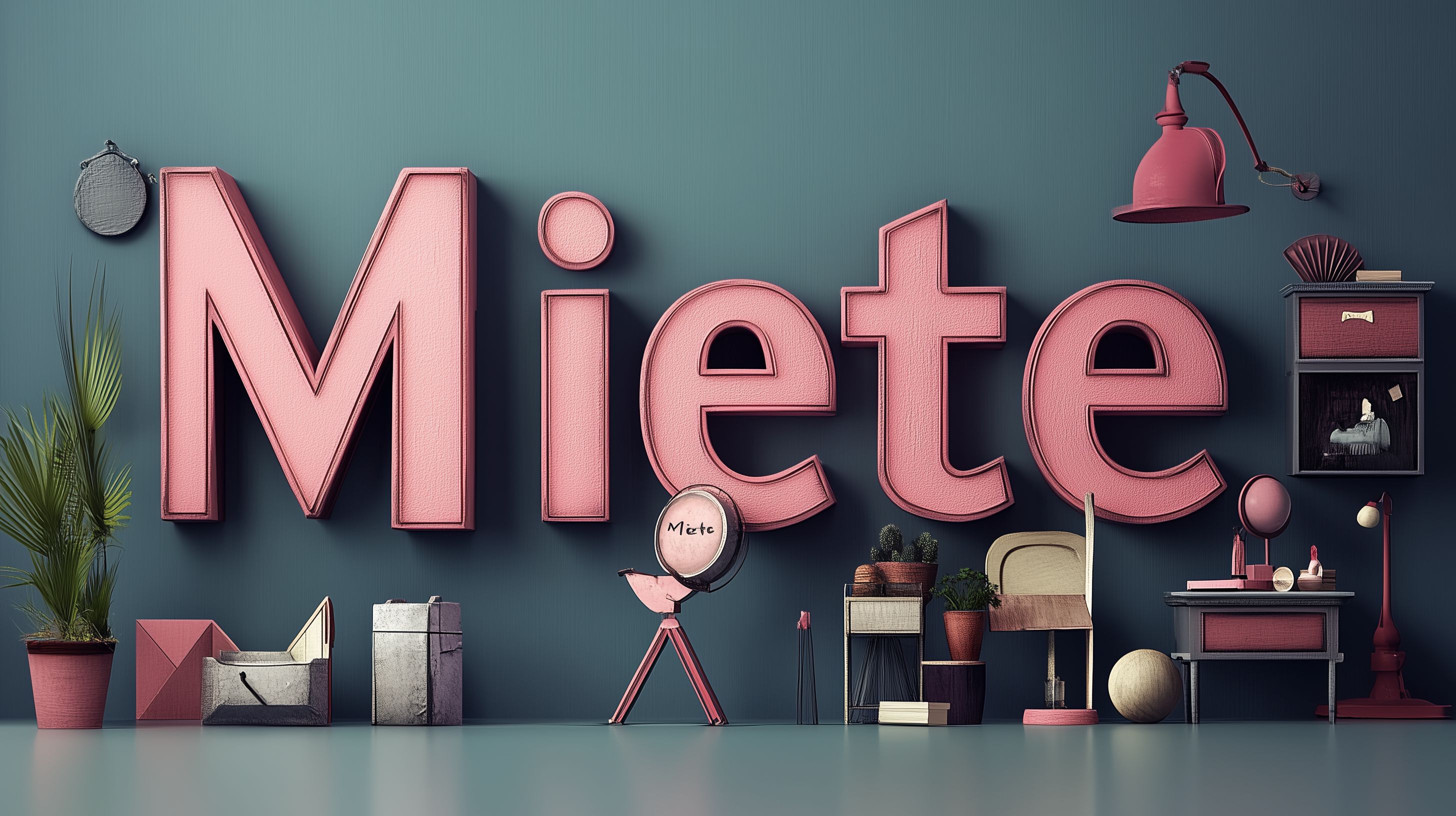 Das Bild zeigt eine kreativ gestaltete Darstellung des Wortes 'Miete' aus verschiedenen Haushaltsgegenständen und Möbelstücken vor einer grünen Wand. Die großen pinken Buchstaben sind prominent im Vordergrund platziert und werden durch kleine runde Akzente wie einen Becher und eine Lampe ergänzt. Neben den Buchstaben finden sich weitere Dekorationselemente wie ein Metallregal, Pflanzen und weitere Accessoires. Der Kontrast zwischen den kräftigen Farbtönen und der dunklen Wand erzeugt eine moderne, stimmungsvolle Atmosphäre.