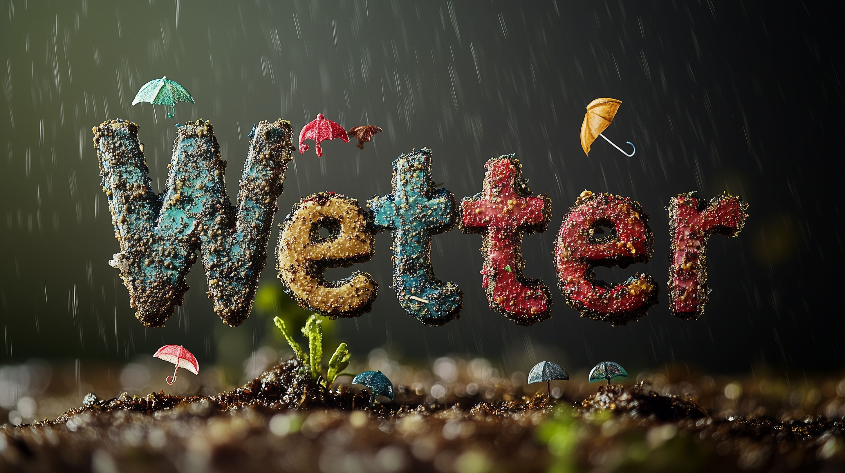 Dieses kreative Regenwetter-Motiv ist eine kunstvoll gestaltete Komposition aus Erdmaterial und Regenschirmen. Die Buchstaben des Wortes 'Wetter' sind aus Erde und anderen natürlichen Materialien geformt und mit bunten Regenschirmen akzentuiert. Das Bild vermittelt eine stimmungsvolle, natürliche Atmosphäre und lässt sich vielfältig einsetzen - z.B. für Blog-Beiträge, Newsletter, Social Media-Posts oder Werbematerial rund um das Thema Wetter, Natur und Jahreszeiten. Als kostenloses, hochauflösendes Stockfoto unter Creative-Commons-Lizenz eignet es sich hervorragend für Ihre Projekte.