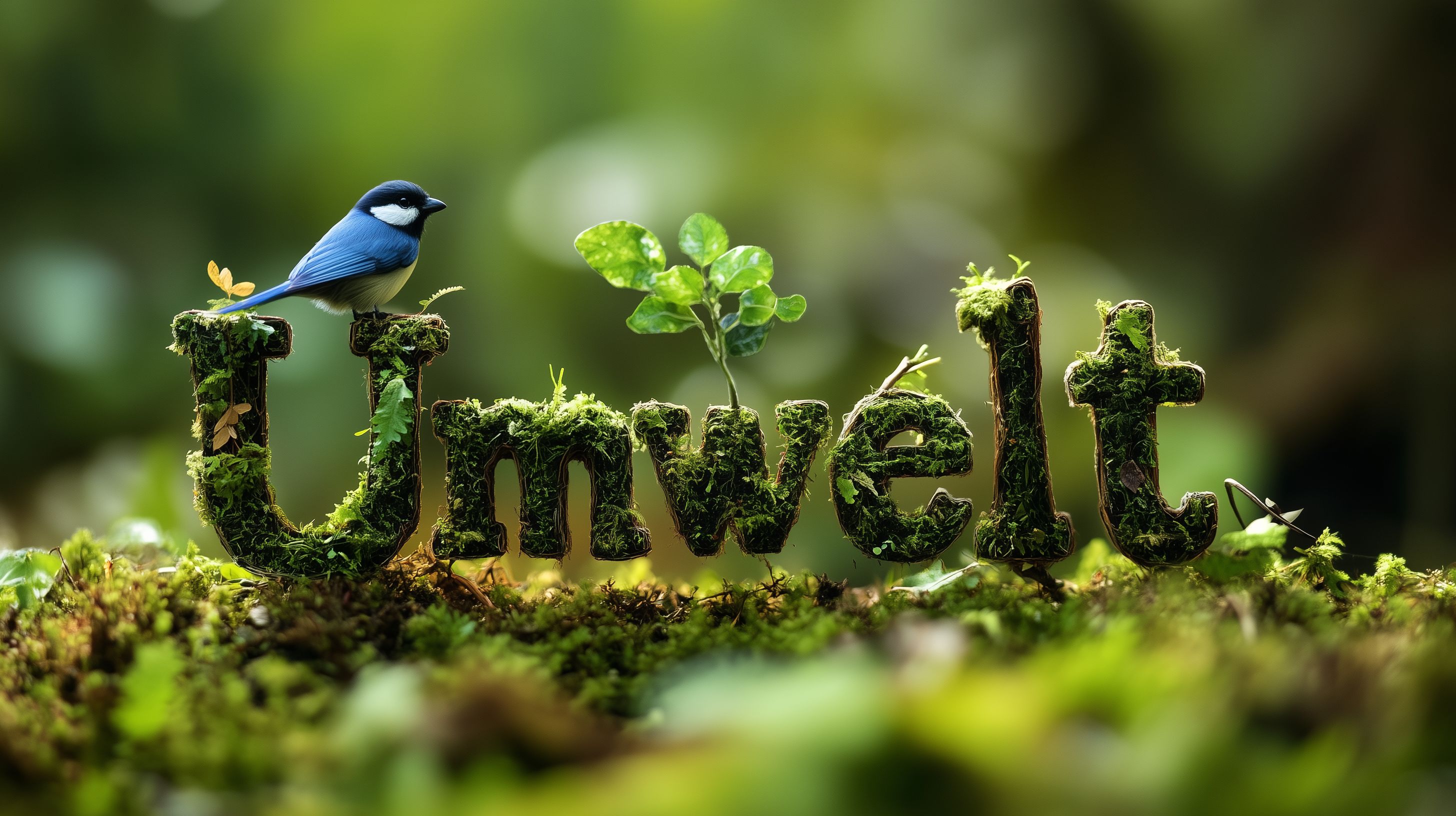 Dieses Foto zeigt einen kreativen und natürlichen Schriftzug, der aus Moos und anderen Naturmaterialien gestaltet ist. Der Schriftzug 'Umwelt' ist in grünen, organisch geformten Buchstaben dargestellt und wird von einem kleinen Blaumeisenvogel ergänzt, der auf einem der Buchstaben sitzt. Der gesamte Hintergrund ist verschwommen, sodass der Fokus ganz auf dem natürlichen Motiv liegt. Dieses Bild eignet sich hervorragend als kostenloses Stockfoto für Blogs, Websites oder Social-Media-Beiträge, die sich mit Themen wie Nachhaltigkeit, Umweltschutz oder Ökologie beschäftigen. Es hat eine hohe Auflösung und steht unter der Creative-Commons-Lizenz zur freien Verwendung zur Verfügung.
