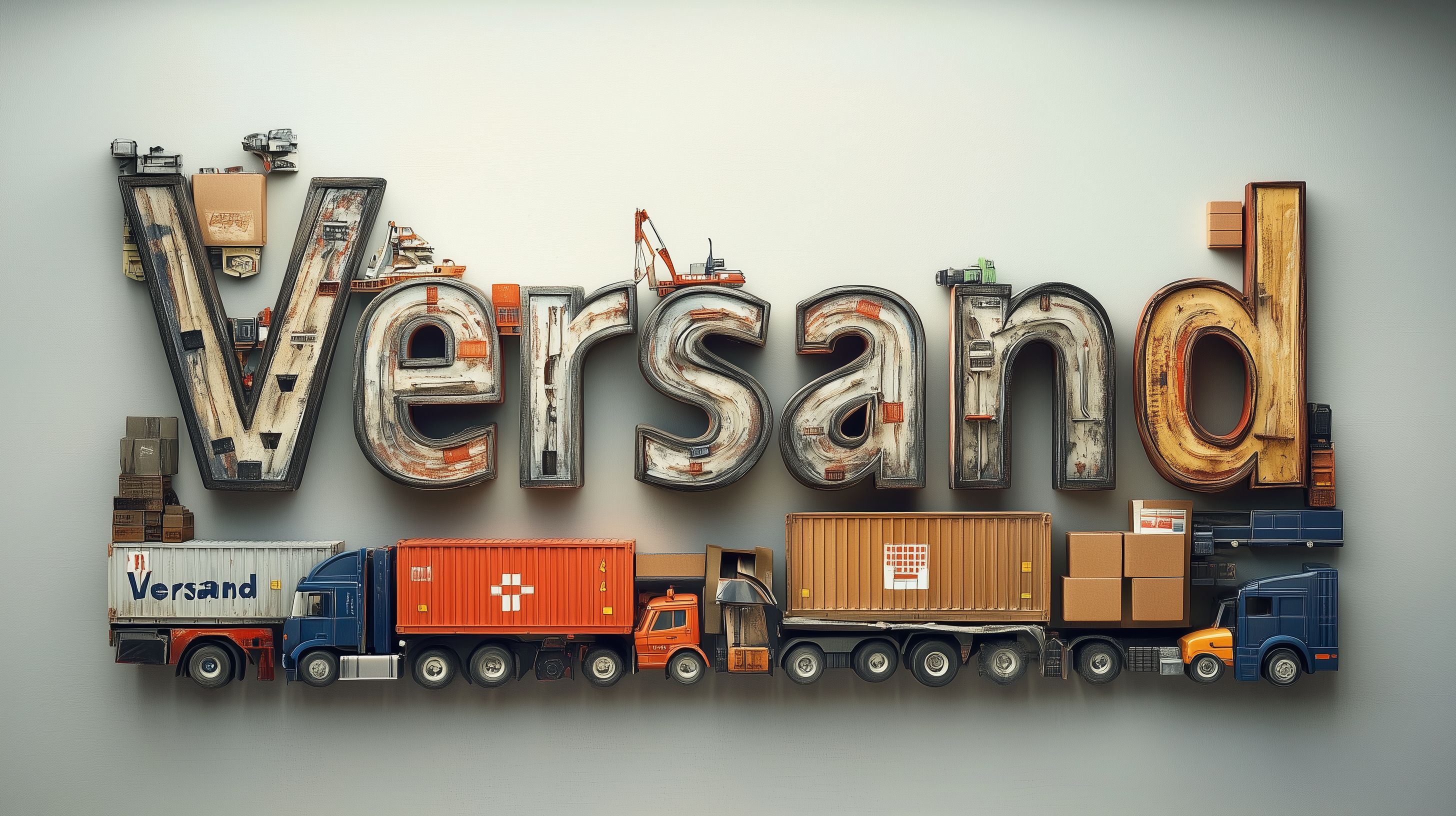 Dieses kreative Foto zeigt eine vintage-inspirierte Illustration zum Thema Versandlogistik. Es präsentiert einen typografischen Schriftzug 'Versand' umgeben von Elementen wie Containerwagen, Paketen und Lastwagen in einem industriellen, retro-futuristischen Stil. Die Farbpalette ist überwiegend in Grautönen gehalten, was dem Bild einen stimmungsvollen, klassischen Look verleiht. Diese Szene eignet sich hervorragend als Motiv für Blogs, Newsletter, Social-Media-Beiträge oder Werbekampagnen im Bereich Logistik, Lieferservice oder Online-Handel. Das hochauflösende Foto ist unter der Creative-Commons-Lizenz verfügbar und kann kostenlos für Ihre digitalen Projekte genutzt werden.