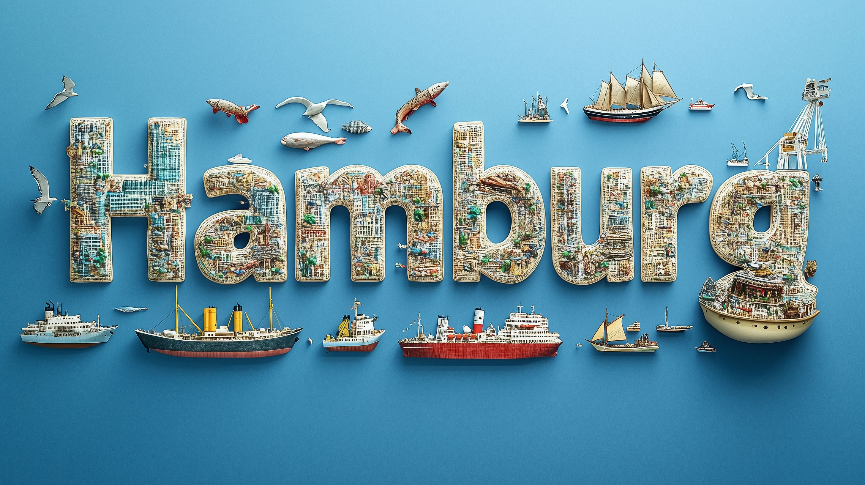 Das Bild zeigt eine kreative Collage mit dem Namen 'Hamburg' in den Vordergrund gesetzt. Der Hintergrund ist ein sattes Blau, das den Himmel und das Meer symbolisieren könnte. In den Buchstaben und darüber sind verschiedene Schiffe, Boote und maritime Symbole angeordnet, die den Hafen und die Schifffahrt von Hamburg repräsentieren. Die Illustration hat einen skizzenhaften, handgemalten Stil und vermittelt eine dynamische, maritime Atmosphäre.