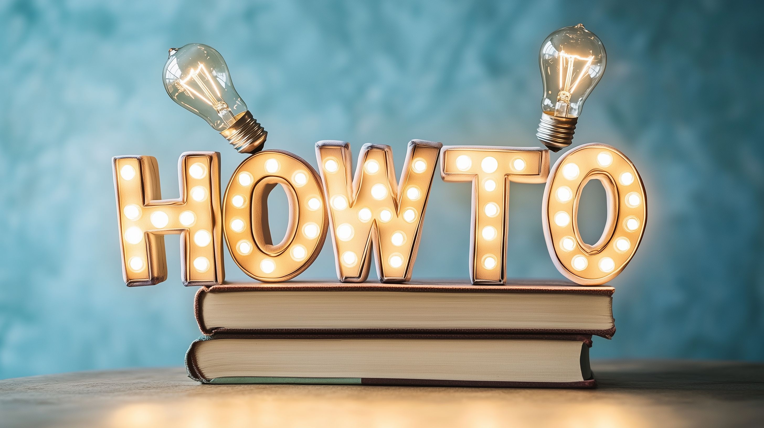 Dieses Foto zeigt einen kreativen Aufbau mit leuchtenden Schriftzügen und Glühbirnen, die auf Büchern platziert sind. Die goldenen, beleuchteten Lettern des Wortes 'HOWTO' sollen Inspiration für DIY-Projekte, Werbemittel oder dekorative Accessoires liefern. Die Anordnung in einem hellen, minimalistischen Ambiente mit einem leicht strukturierten Hintergrund verleiht dem Bild einen modernen, vintage-inspirierten Charakter. Das hochaufgelöste Foto eignet sich ideal als kostenloses Stockfoto für kreative Blog-Beiträge, Newsletter-Gestaltung, Social-Media-Posts oder Werbezwecke unter einer Creative-Commons-Lizenz.