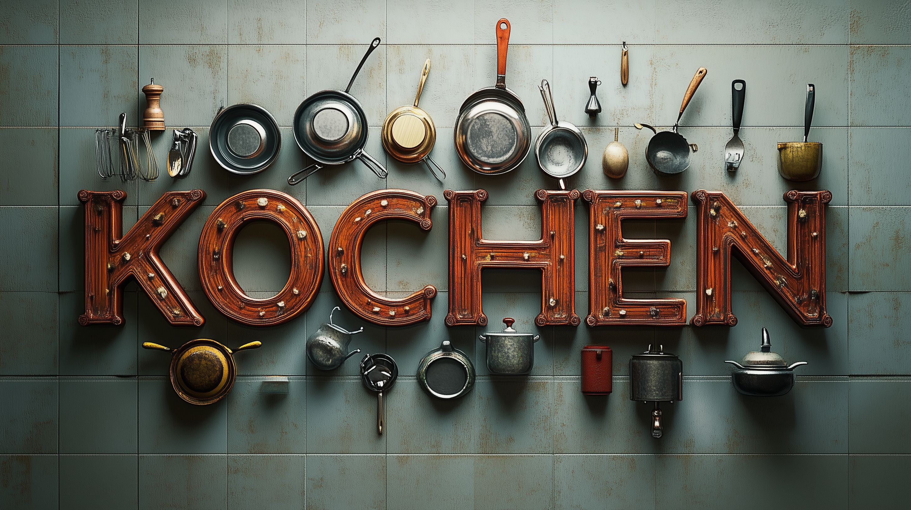 Dieses rustikale Foto zeigt eine Anordnung von verschiedenen vintage Küchenutensilien in einem grünen, metallischen Ambiente. Die Komposition beinhaltet eine Vielzahl von Kochgeräten wie Töpfe, Pfannen, Messer und andere Küchenaccessoires, die in einem zurückhaltenden, farblich abgestimmten Layout präsentiert werden. Die Textur und der Vintage-Stil der Elemente verleihen dem Bild einen authentischen, handwerklichen Charakter, der sich hervorragend für den Einsatz in Kochbüchern, Foodblogs, Restaurantwebsites oder anderen kulinarischen Kontexten eignet. Dieses hochauflösende, kostenlose Stockfoto steht unter der Creative-Commons-Lizenz zur Verfügung.