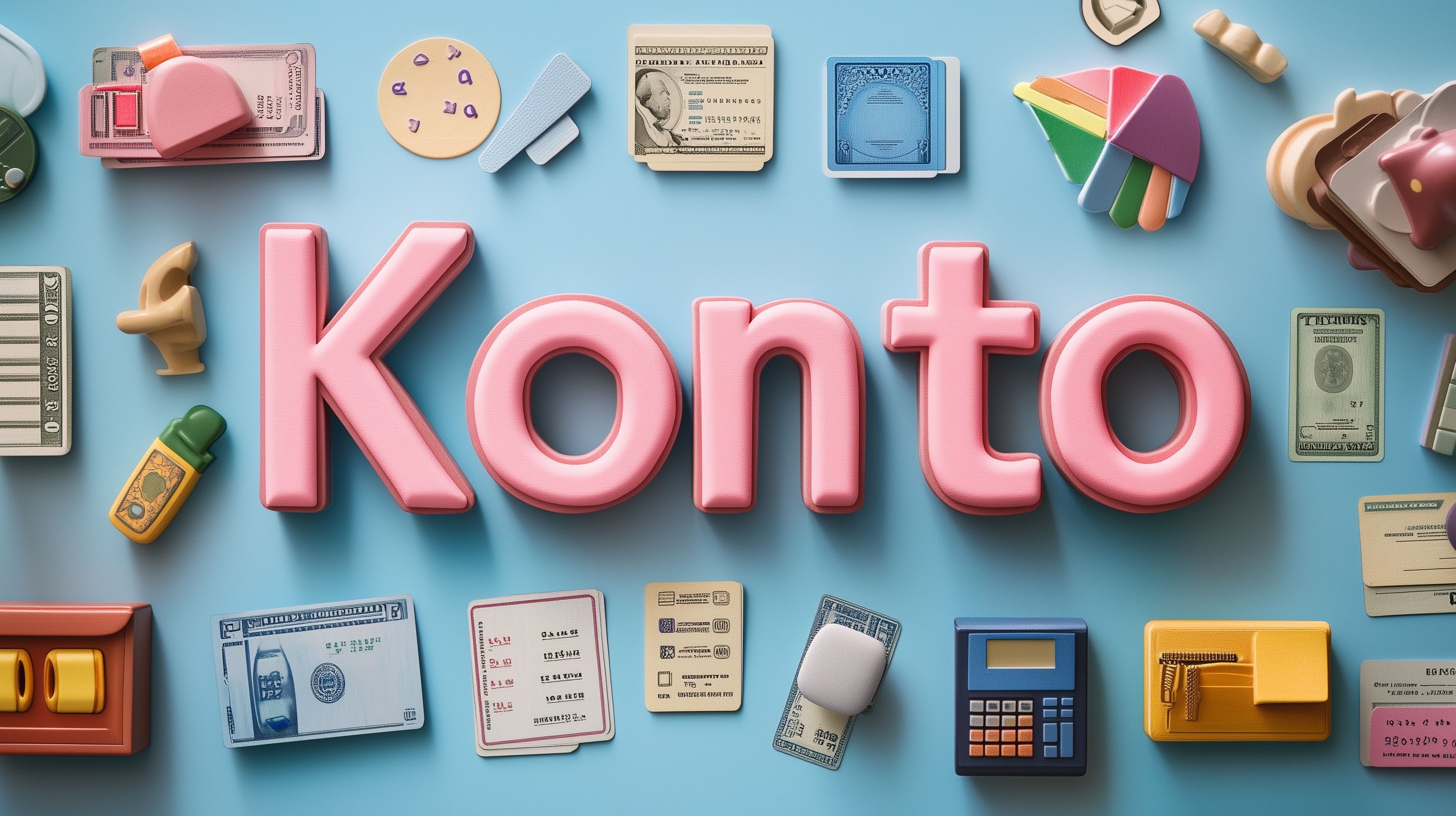 Dieses farbenfrohe Foto zeigt ein Konzept rund um Bankgeschäfte und Finanzmanagement. Im Vordergrund prangt der große, rosa Schriftzug 'Konto', umgeben von verschiedenen Symbolen und Objekten, die typisch für das Thema Finanzen sind. Dazu gehören Geldscheine, Taschenrechner, Kontoauszüge und andere Büroartikel. Die Elemente sind vor einem himmelblauen Hintergrund kreativ und flach angeordnet, was eine modern-minimalistische Ästhetik erzeugt. Das Foto eignet sich hervorragend für den Einsatz in Blogs, Newslettern, Social-Media-Beiträgen oder Werbematerialien rund um Themen wie Bankgeschäfte, Finanzen, Buchhaltung oder Geschäftsorganisation. Als hochauflösendes, kostenloses Stockfoto unter einer Creative-Commons-Lizenz bietet es Gestaltungsspielraum für viele Einsatzzwecke.