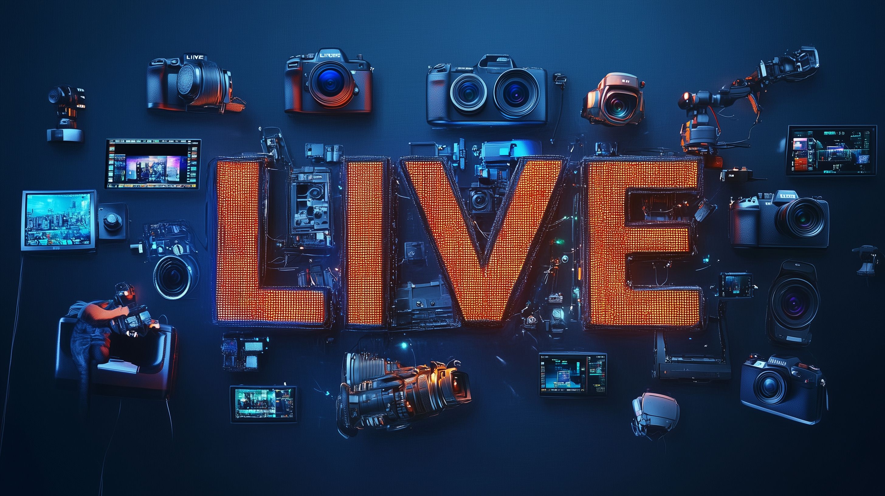 Dieses eindrucksvolle Bild präsentiert eine Vielzahl an Fotografie-Equipment und -Zubehör vor einem dunkelblauen Hintergrund. Der orangefarbene Schriftzug 'LIVE' hebt sich kontrastreich ab und verleiht dem Arrangement einen modernen, technischen Charakter. Die Anordnung der Kameras, Objektive, Aufnahmegeräte und Zusatzkomponenten wie Monitore und Steuereinheiten vermittelt den Eindruck einer professionellen Fotografieumgebung und inspiriert zu kreativen Fotoprojekten in verschiedensten Einsatzbereichen - ob für Blog, Newsletter, Social Media oder Werbezwecke. Dieses hochauflösende, lizenzfreie Stockfoto eignet sich hervorragend für digitale Medienpublikationen und visuelle Konzepte rund um das Thema Fotografie und Bildgestaltung.