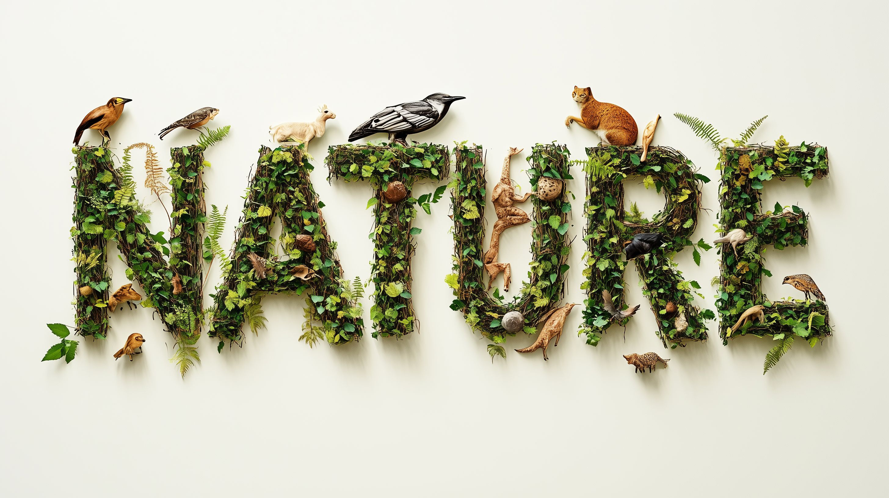 Dieses beeindruckende Foto zeigt einen Schriftzug, der komplett aus natürlichen Elementen wie Blättern, Zweigen und Tieren besteht. Die Buchstaben sind liebevoll aus Moos, Holz und verschiedensten Lebewesen wie Vögeln, Eichhörnchen und Insekten gestaltet, was dem Ganzen eine organische, lebendige Ausstrahlung verleiht. Die Komposition ist stimmungsvoll und harmonisch, mit einer Vielzahl an Details, die den Betrachter zum Entdecken und Verweilen einladen. Dieses kostenfrei nutzbare Stockfoto eignet sich ideal für Hintergrundbilder, Naturthemen oder Naturschutz-Kampagnen in hoher Auflösung und unter Creative-Commons-Lizenz.