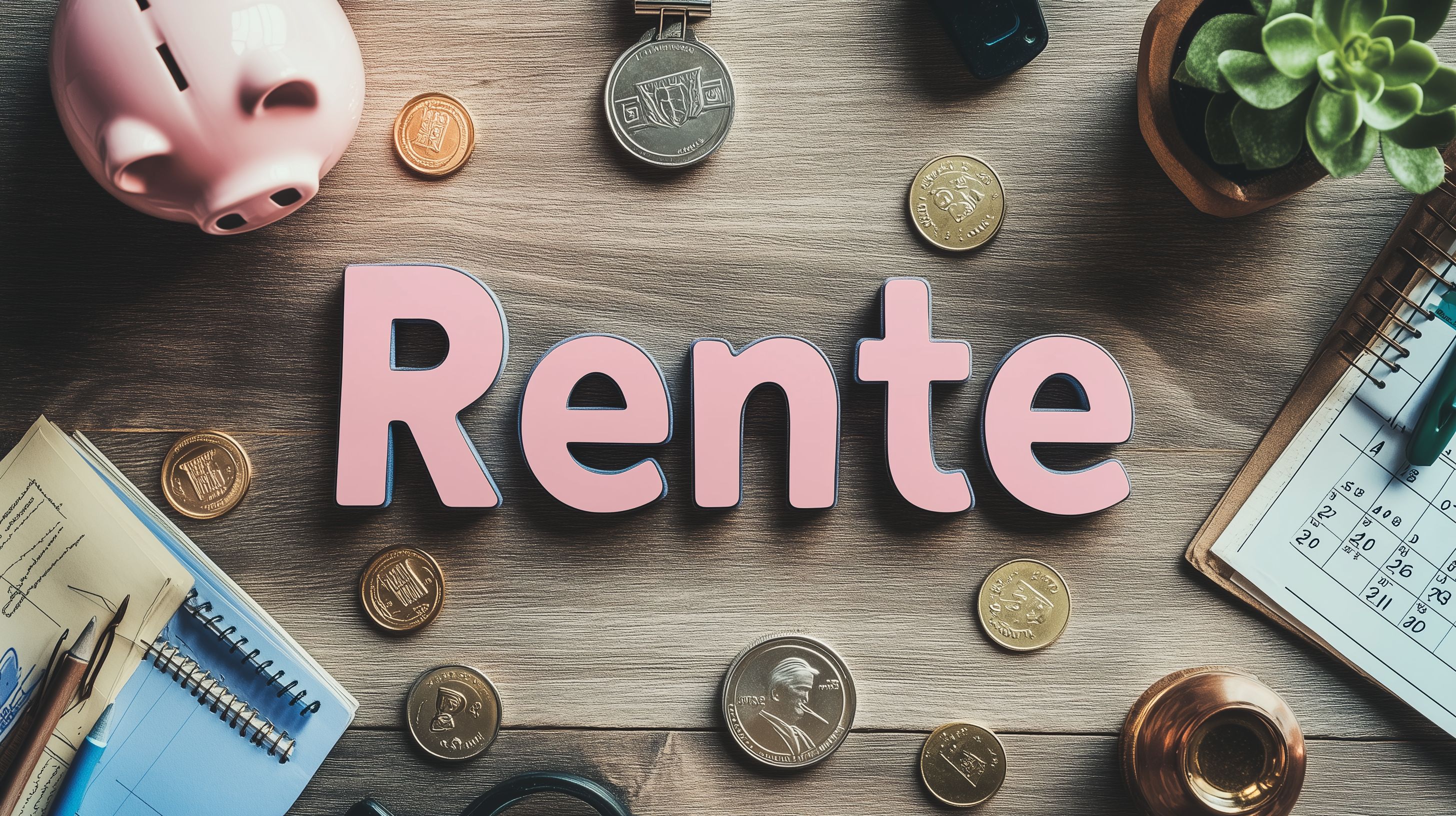 Dieses Foto zeigt ein Rente-Konzept mit einem rosafarbenen Sparschwein, Münzen und verschiedenen Finanzdokumenten auf einem Holztisch. Der Fokus liegt auf dem Wort 'Rente', das in großen, rosa Buchstaben im Zentrum des Bildes platziert ist. Umgeben sind diese Elemente von Büroartikeln wie einem Notizblock und einem Stift sowie einer Zimmerpflanze, die dem Arrangement einen natürlichen Touch verleihen. Die flache Draufsicht auf den Tisch vermittelt einen minimalistischen und aufgeräumten Stil. Dieses Foto eignet sich hervorragend als kostenloses Stockfoto in hoher Auflösung für Beiträge zu den Themen Rente, Altersvorsorge, Finanzen und Investitionen, beispielsweise in Blogs, Newslettern oder Social-Media-Kanälen. Es steht unter einer Creative-Commons-Lizenz zur freien Nutzung zur Verfügung.
